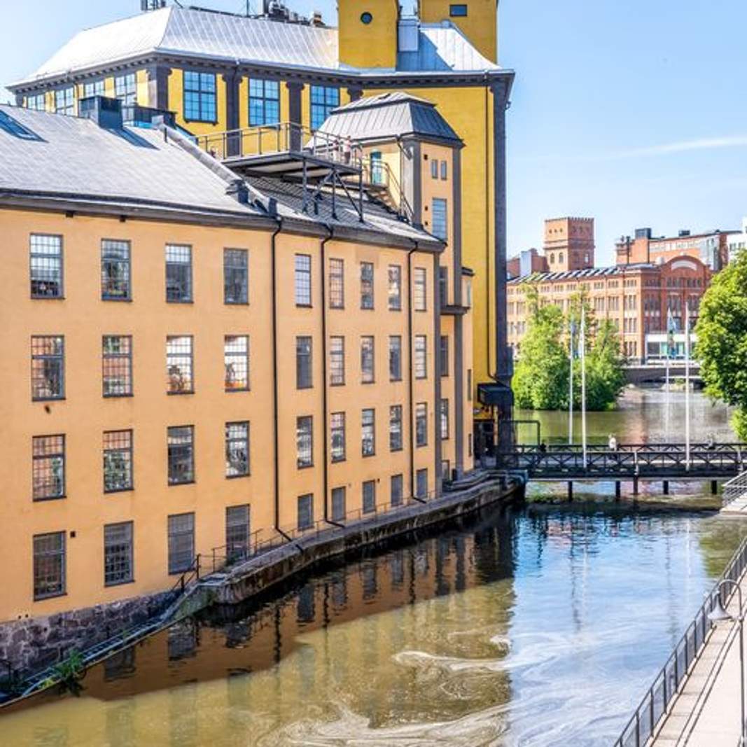 Området domineras av Strömmens forsande vatten och av ståtliga fabriksbyggnader.
