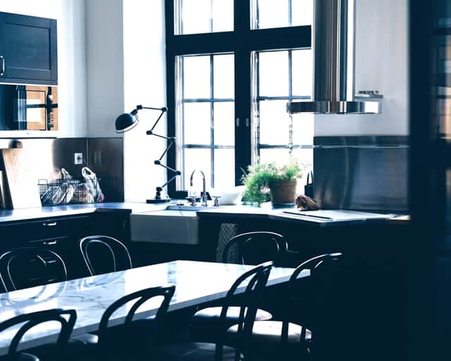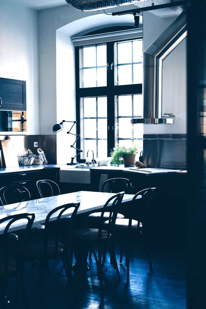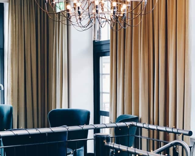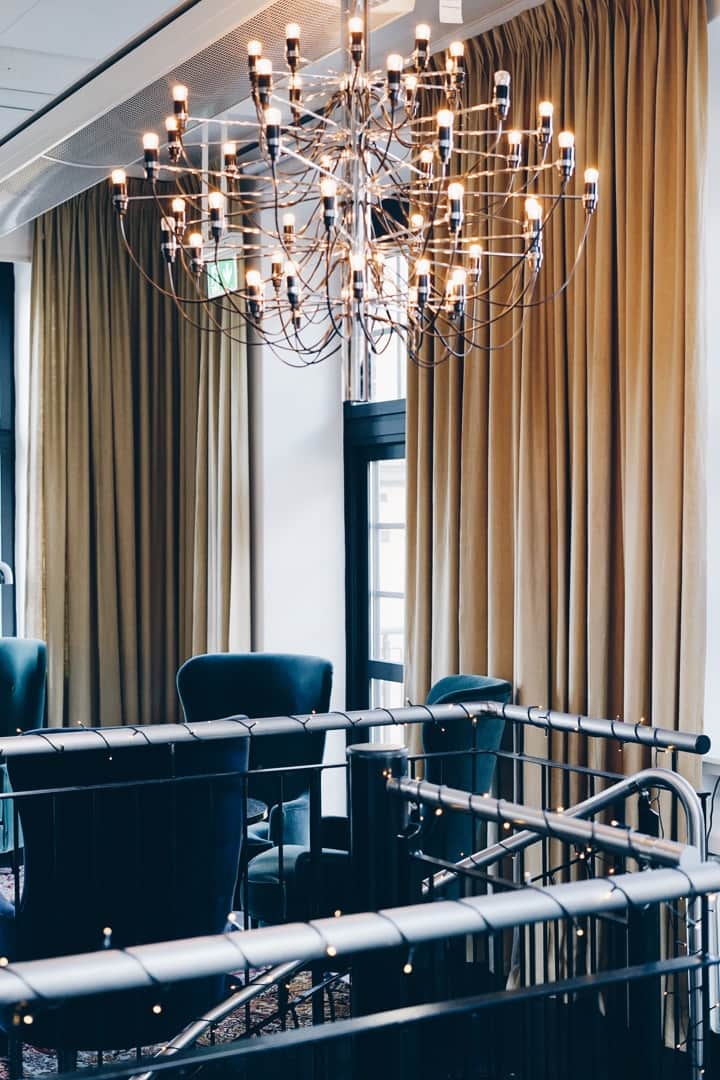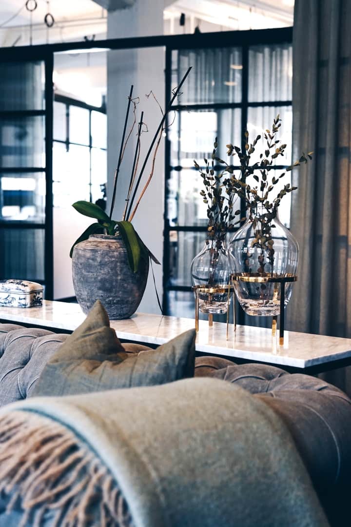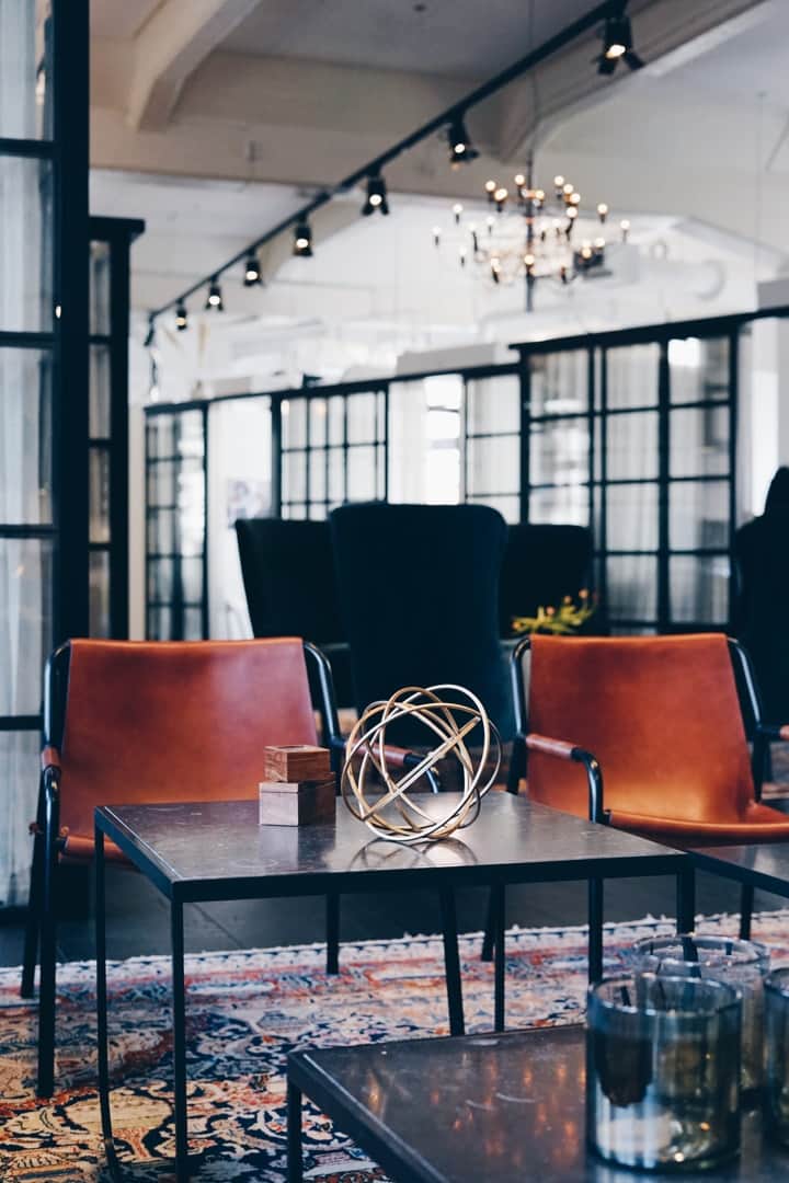 Den rustika känslan förstärks av mörka trägolv och naturnära material, vilket skapar en inbjudande atmosfär. Det öppna taket med synliga rör ger lokalen en industriell och cool karaktär. På övervåningen bidrar den imponerande takhöjden och detaljer som bevarad tegelvägg och stora fönster med svart karm till den stiliga inredningen.