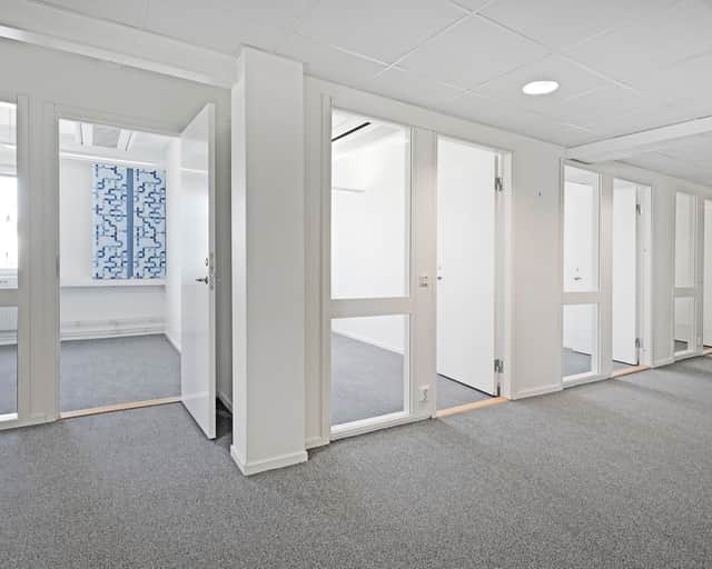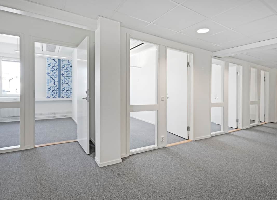 Lokalen erbjuder en blandning av öppna ytor med pentry och lunchutrymme samt även privata arbetsrum i varierande storlek.