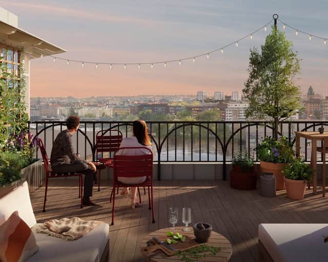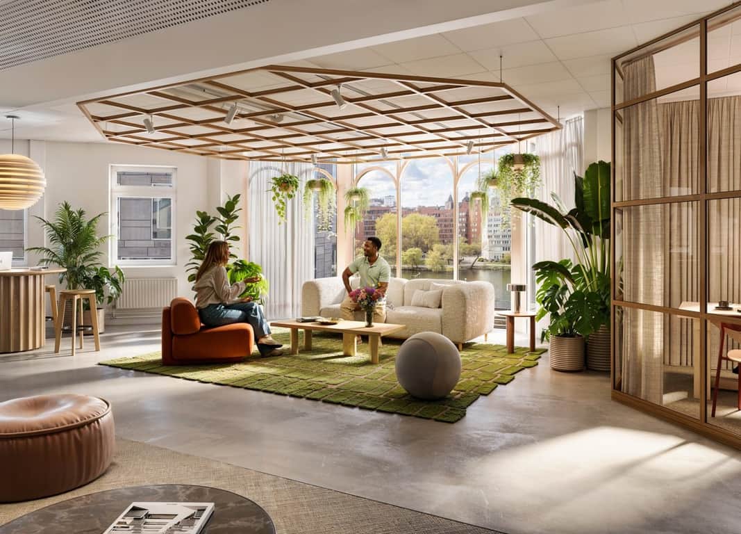 Här leder huvudentrén dig direkt från gatan in till husets gemensamma lobby, servicedesk och restaurang. Där serveras allt från nybryggt kaffe och frukost till lättare luncher och affärsluncher. En separat konferensavdelning och rymlig eventyta gör det enkelt att ordna egna möten eller evenemang. Som kronan på verket finns en gemensam takterrass – högt upp, med fri utsikt. En perfekt plats för lunch i solen, ett avkopplande avbrott eller möten under bar himmel.