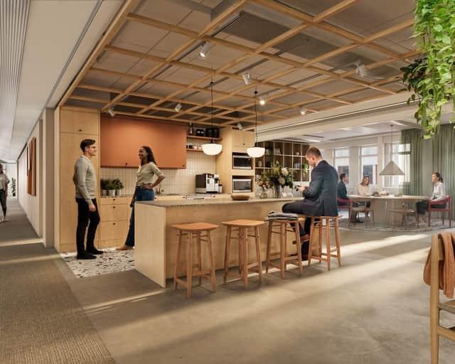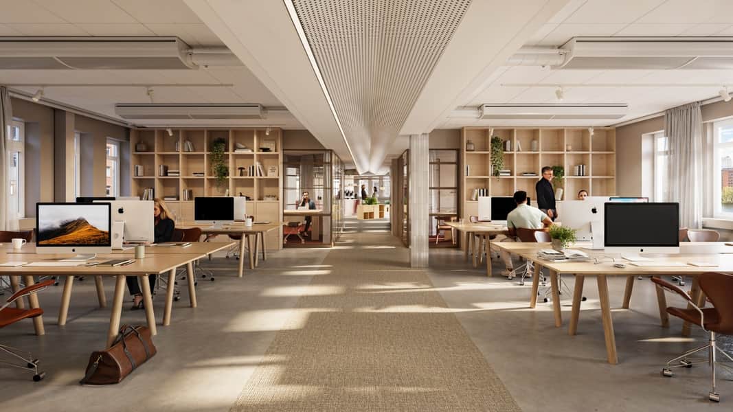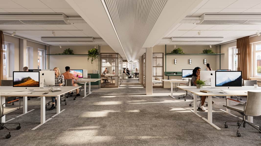 Lokalerna blir nyrenoverade, med varsamt utvalda premiummaterial. Det blir en väl vald mix av nytt och återbrukat från lokalernas tidigare hyresgäst. Synliga installationer ger rymd och en rå, urban känsla som passar det moderna kontoret. Våningsplanen varierar i storlek, från ca 650 upp till 1 300 kvm. De största våningsplanen går bra att länka samman till ytor för upp till 250 medarbetare. Detta är ett förslag på en möjlig delning av ett halvt våningsplan. Välj mellan två olika inredningskoncept för ditt kontor; Sober, som är lite lugnare och har en exklusiv känsla med mjuka mattor och färgtoner, eller Studio som är mer uttrycksfullt, med betonggolv, klinker och lite modigare färger. Oavsett val kommer alla fönster och burspråk att återställas till sin ursprungliga storlek, vilket släpper in mer ljus och öppnar upp rummen. Resultatet: ljusa, luftiga kontor med stora möjligheter att anpassa efter behov.