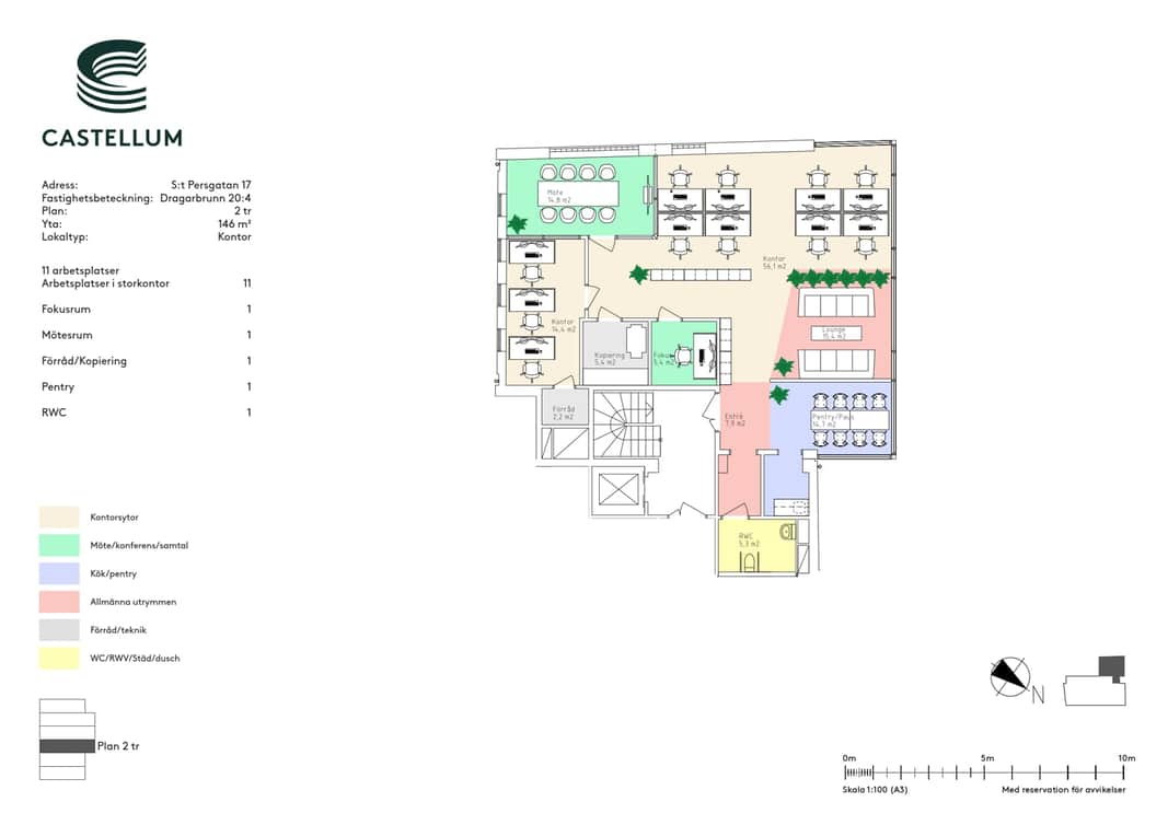 Lokalen erbjuder en blanding av öppet kontorslandskap, samtalsrum och mötesrum samt pentry. Här finns även möjligheten att anpassa lokalen utefter verksamhetens behov.