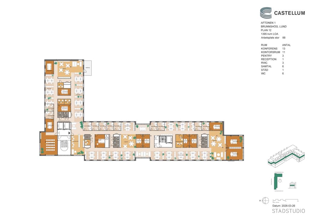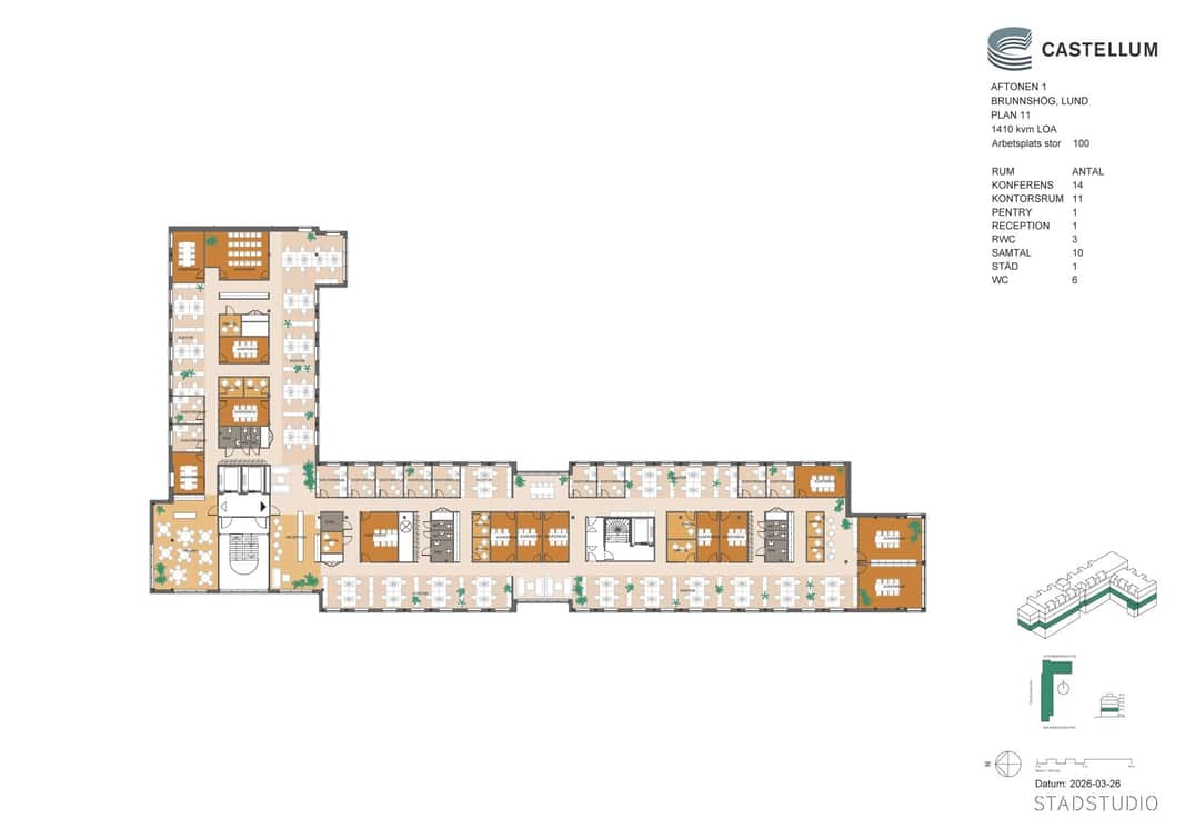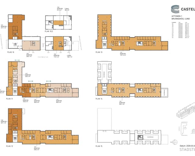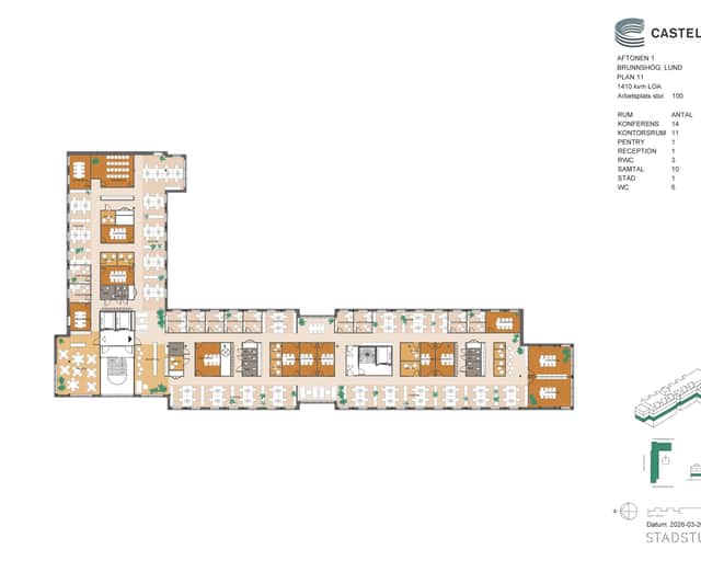 Ytan är disponerad med ett tydligt och effektivt flöde där entré och gemensamma ytor samlar verksamheten och skapar naturliga mötesplatser. Arbetsplatserna är placerade längs fasaden för att ta tillvara ljusinsläppet, med möjlighet till både öppna kontorslandskap och mer avskilda rum för möten och fokusarbete. Planlösningen medger flexibla lösningar för samarbete, konferens och sociala ytor, samtidigt som den enkelt kan anpassas efter olika arbetssätt och verksamhetsstorlekar. Utformningen ger goda förutsättningar för en modern och framtidsinriktad arbetsmiljö med hög effektivitet och trivsel.