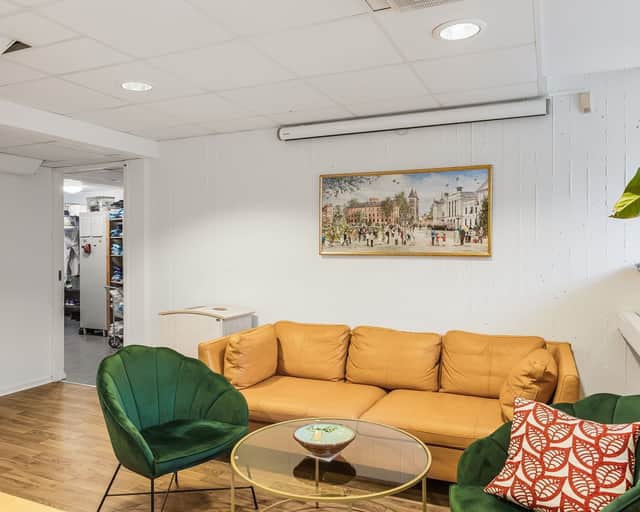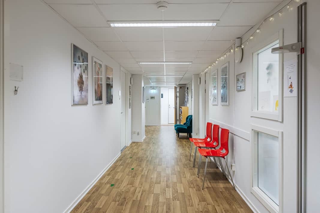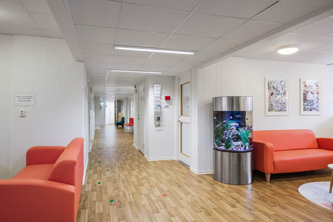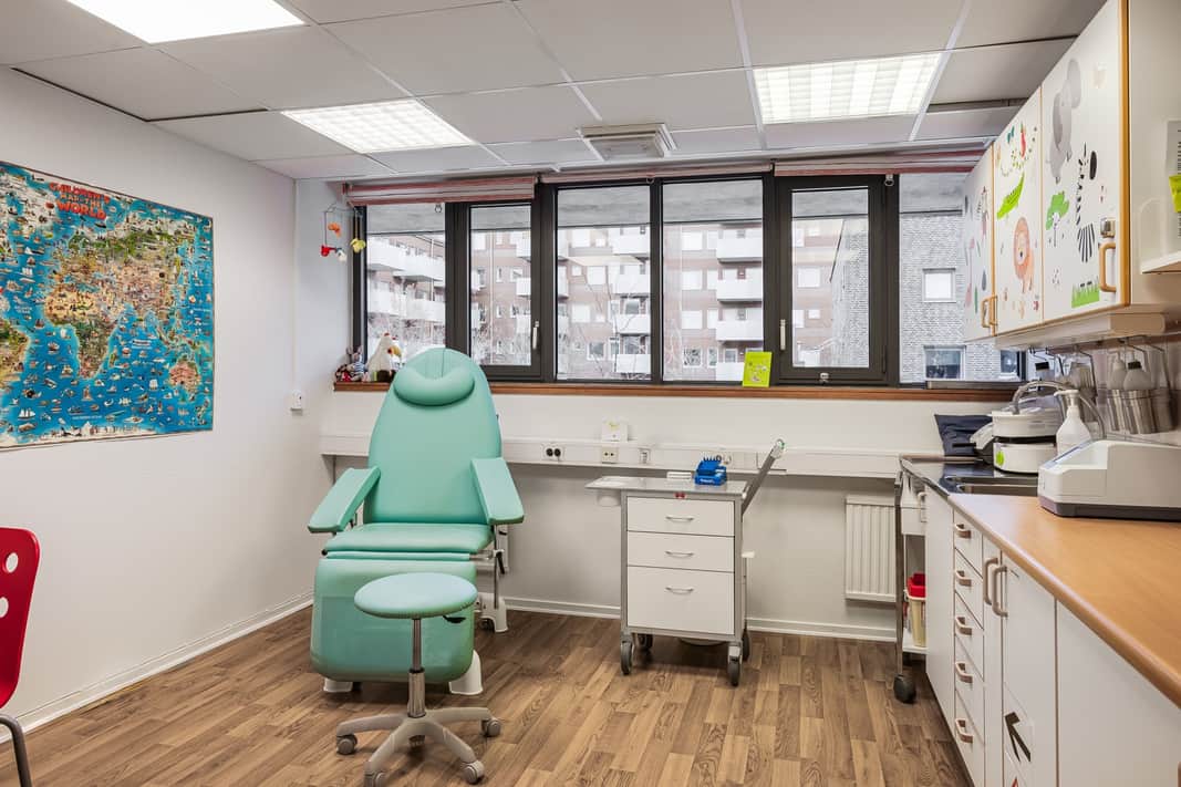 När du stiger in i lokalen möts du direkt av ett naturligt placerat väntrum, utformat för att ge patienter en lugn och bekväm plats att vänta på sitt besök. I övrigt erbjuder lokalen ljusa och trevliga mottagningsrum som är utformade för att ge både personal och patienter en trivsam och miljö. Längst in i lokalen finns ett praktiskt pentry för personalen samt ett omklädningsrum, vilket bidrar till en smidig arbetsdag och underlättar de dagliga rutinerna.