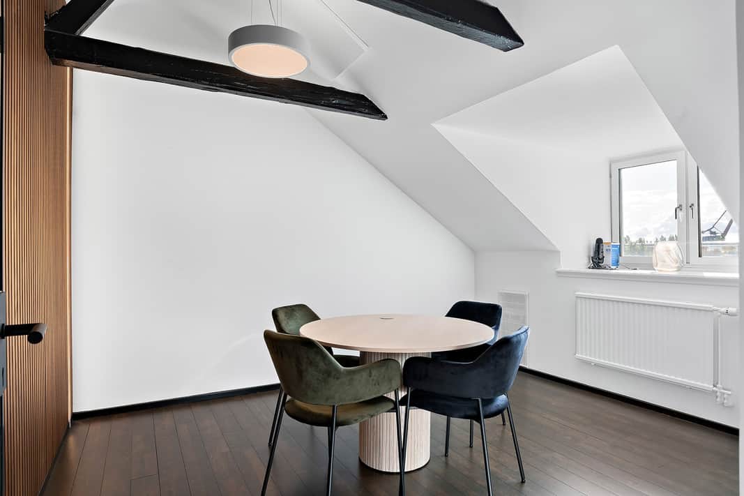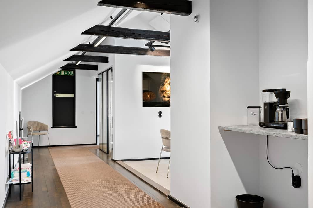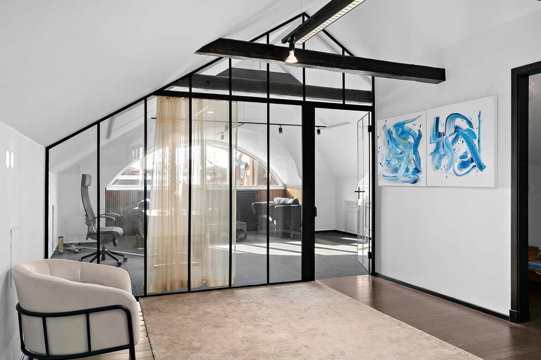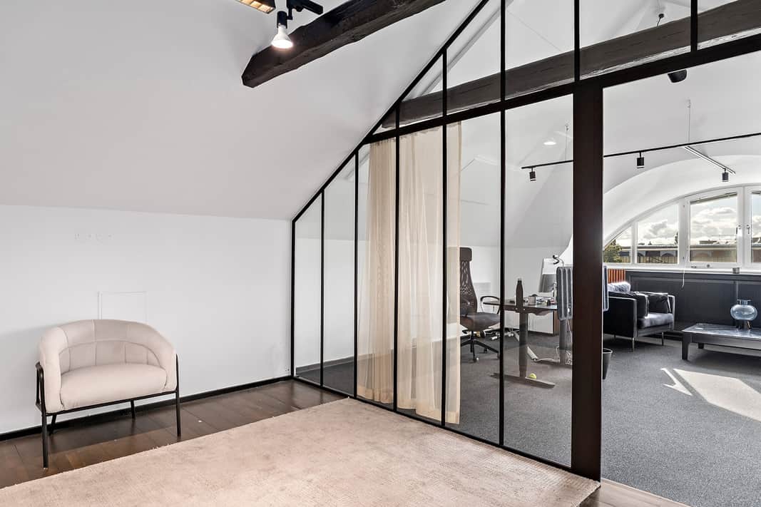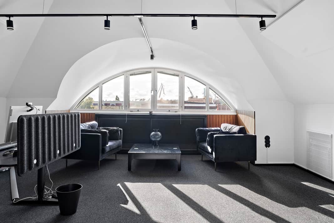 Modern kontorslokal med generös takhöjd och synliga takbjälkar. Glaspartier till kontorytorna för att få igenom ljuset i lokalen via välvda fönster. Här är det lätt för personalen att trivas i en kreativ miljö.