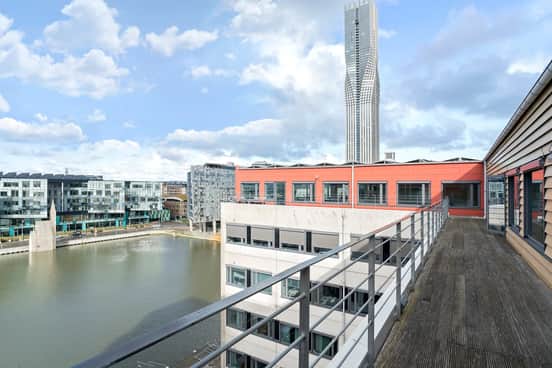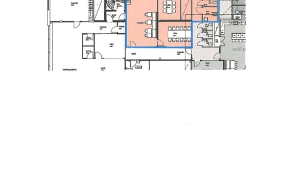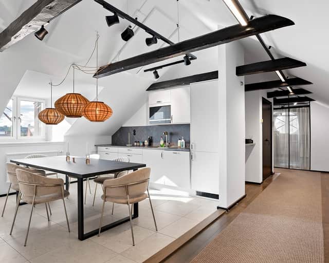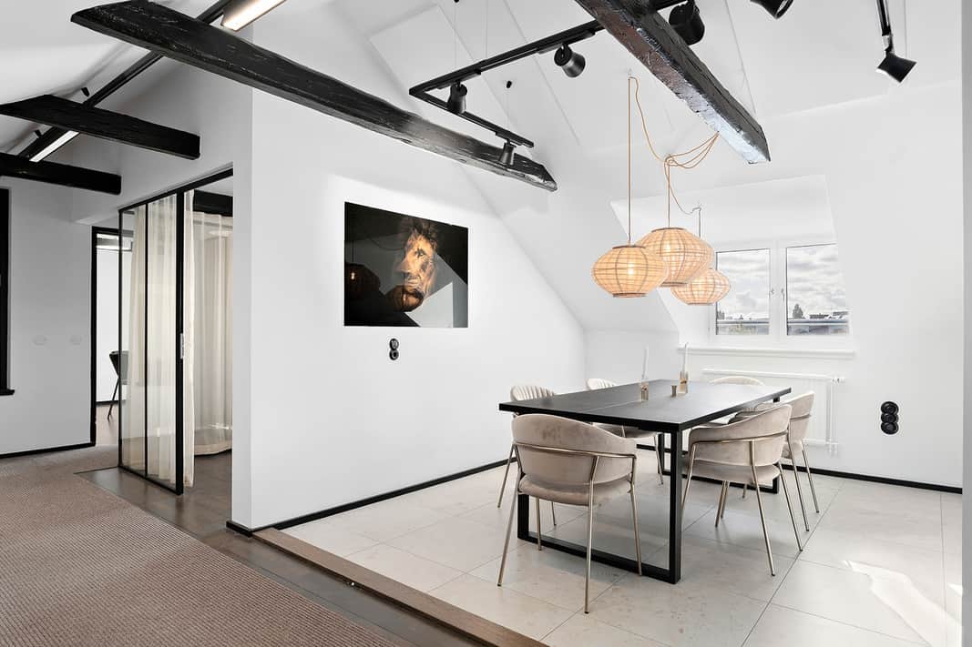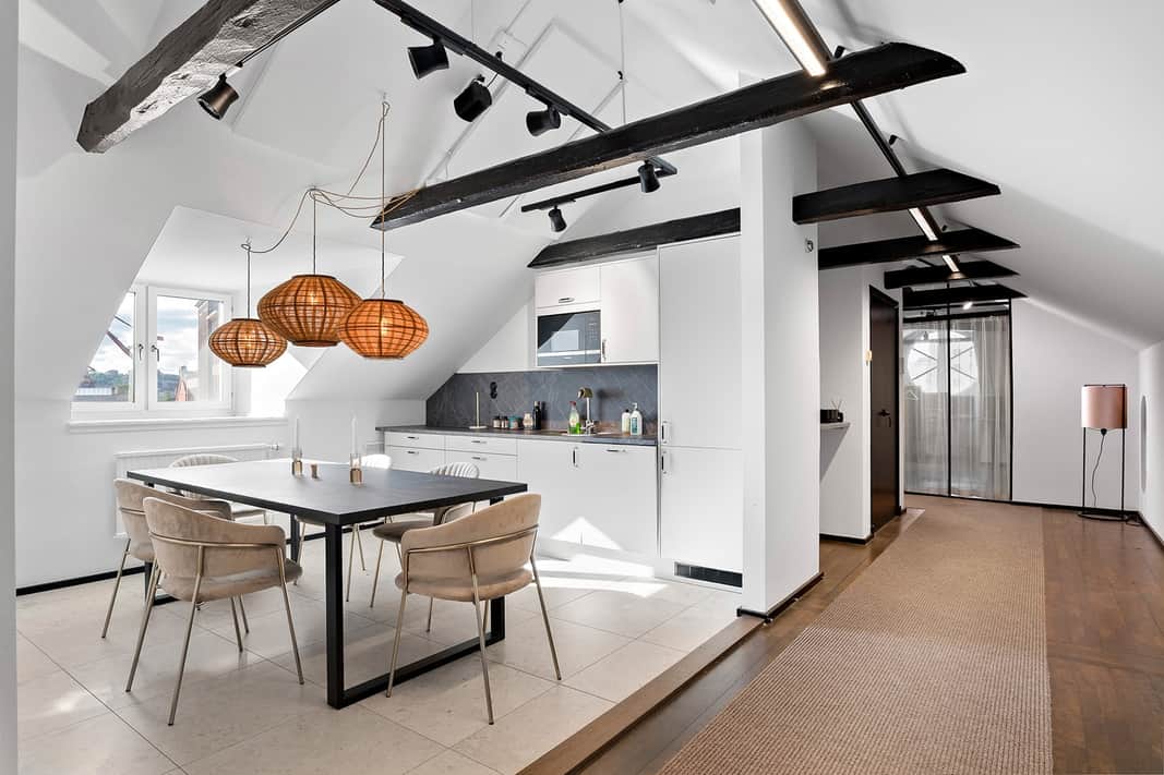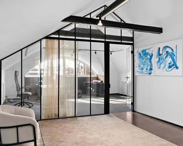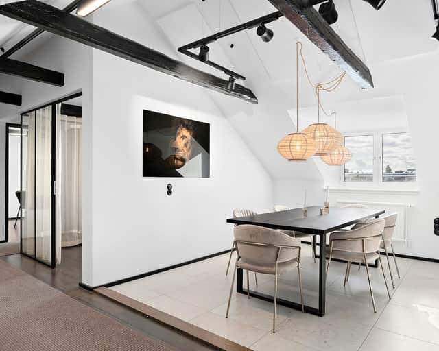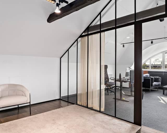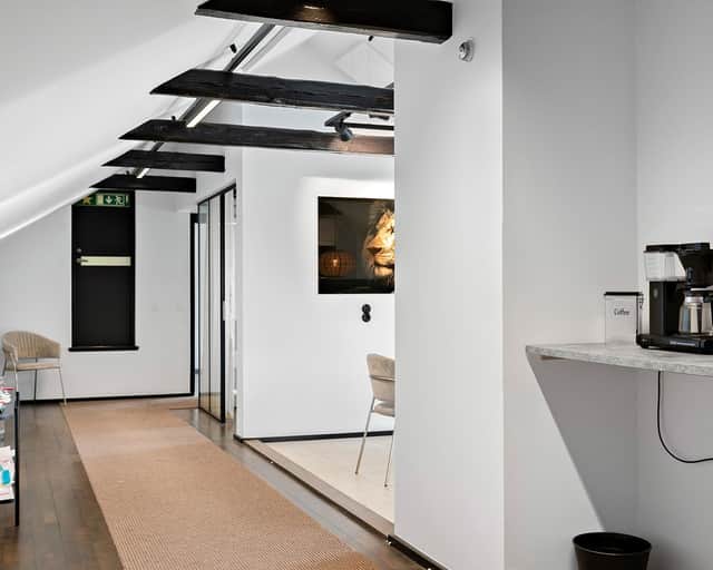 Modern kontorslokal med generös takhöjd och synliga takbjälkar. Glaspartier till kontorytorna för att få igenom ljuset i lokalen via välvda fönster. Här är det lätt för personalen att trivas i en kreativ miljö.