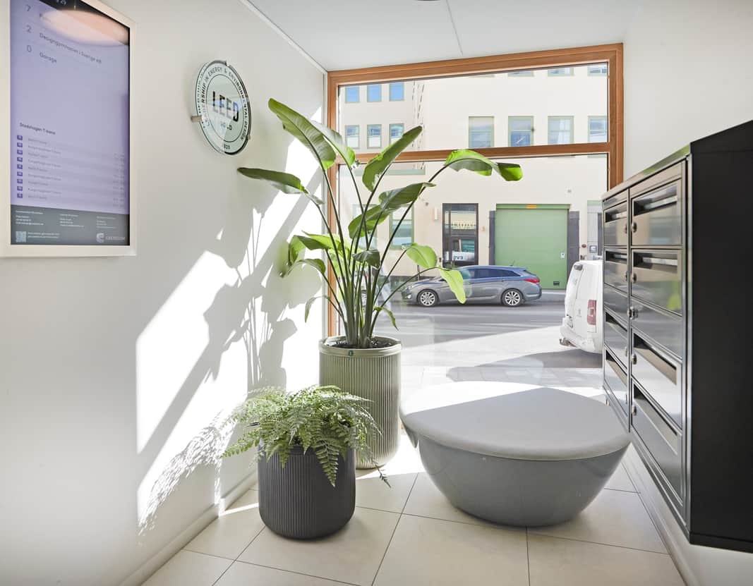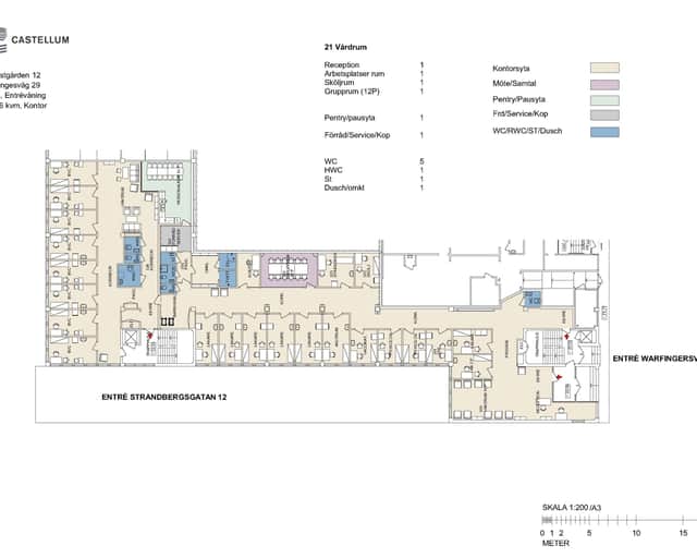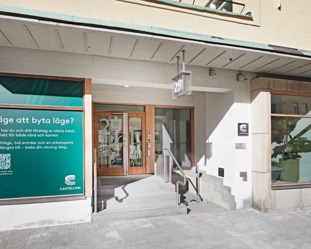 Med två separata entréer kan du enkelt dela upp ingången för personal och externa besökare. Lokalen ligger på Warfvingesväg 29 och Strandbergsgatan 12, 2 trappor upp.