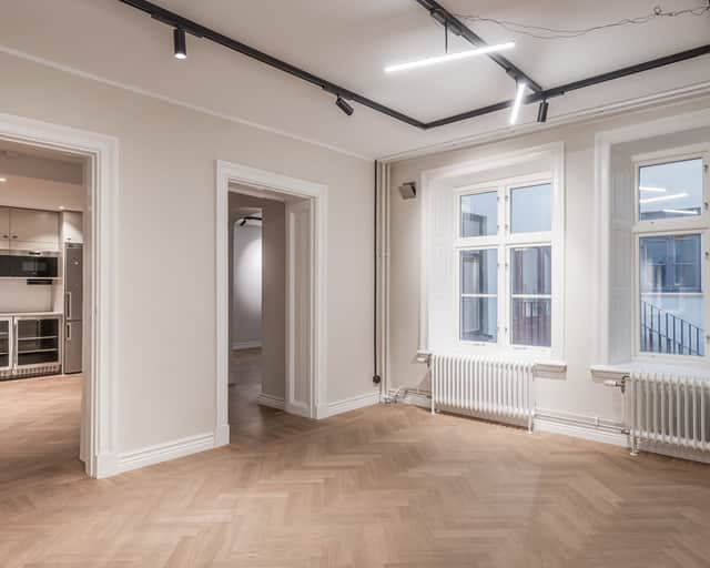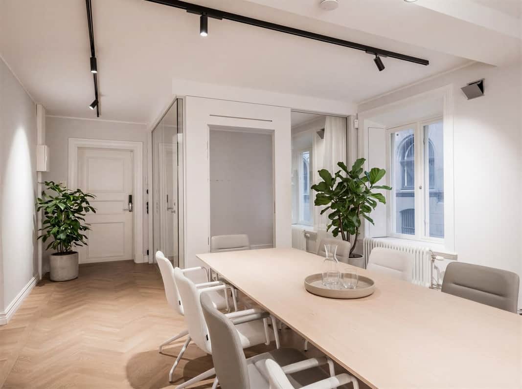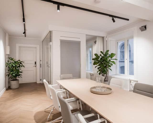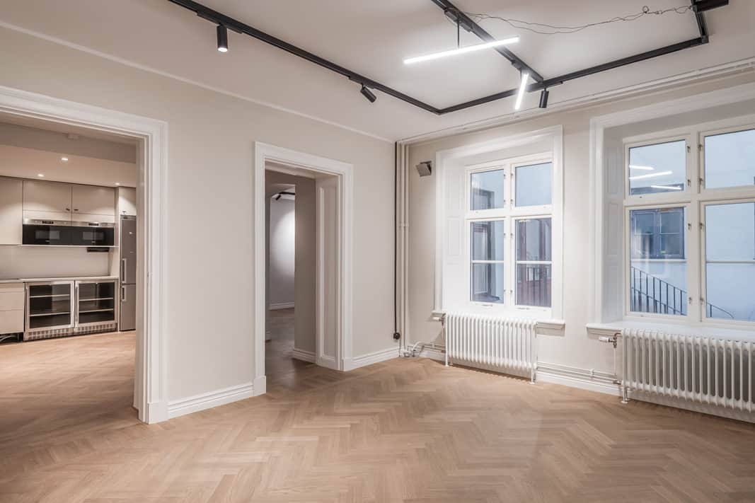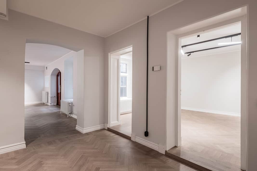 Genomgående i lokalen ligger vacker fiskbensparkett som tillsammans med fastighetens charmiga karaktär skapar en varm och representativ arbetsmiljö. De stora fönstren ger ett generöst ljusinsläpp och bidrar till en ljus och trivsam atmosfär.