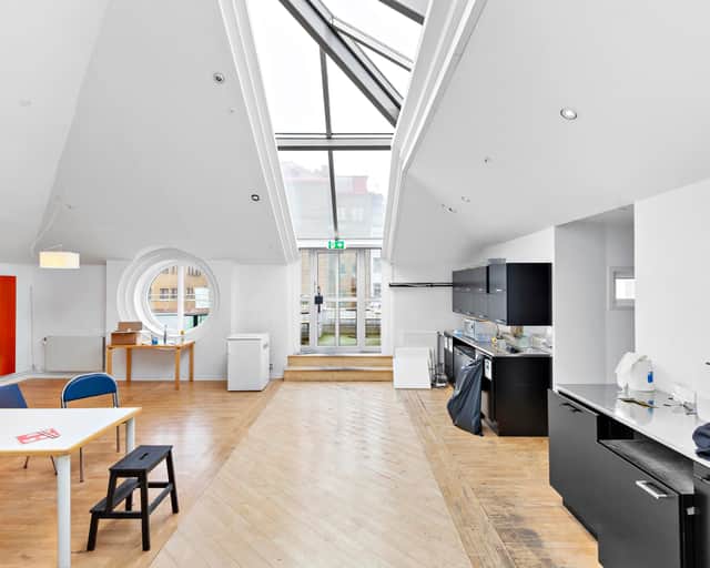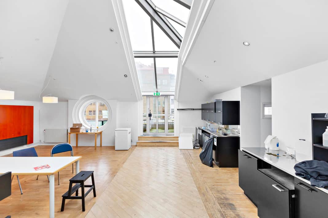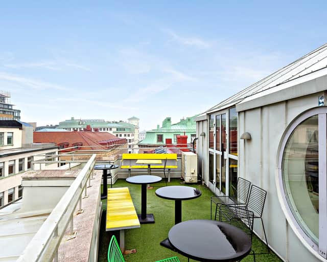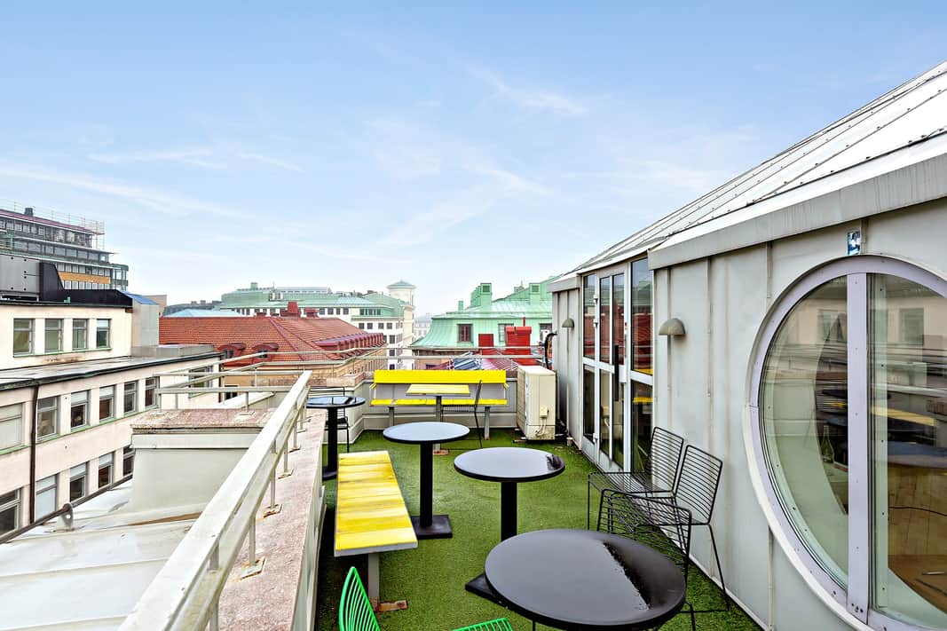 På femte våningen finner ni ett pentry och en inbjudande terrass – en perfekt miljö för spontana möten eller en stunds avkoppling. Lokalen erbjuder en balans mellan sociala ytor och funktionella arbetsplatser, vilket skapar utrymme för både fokuserat arbete och samarbete.