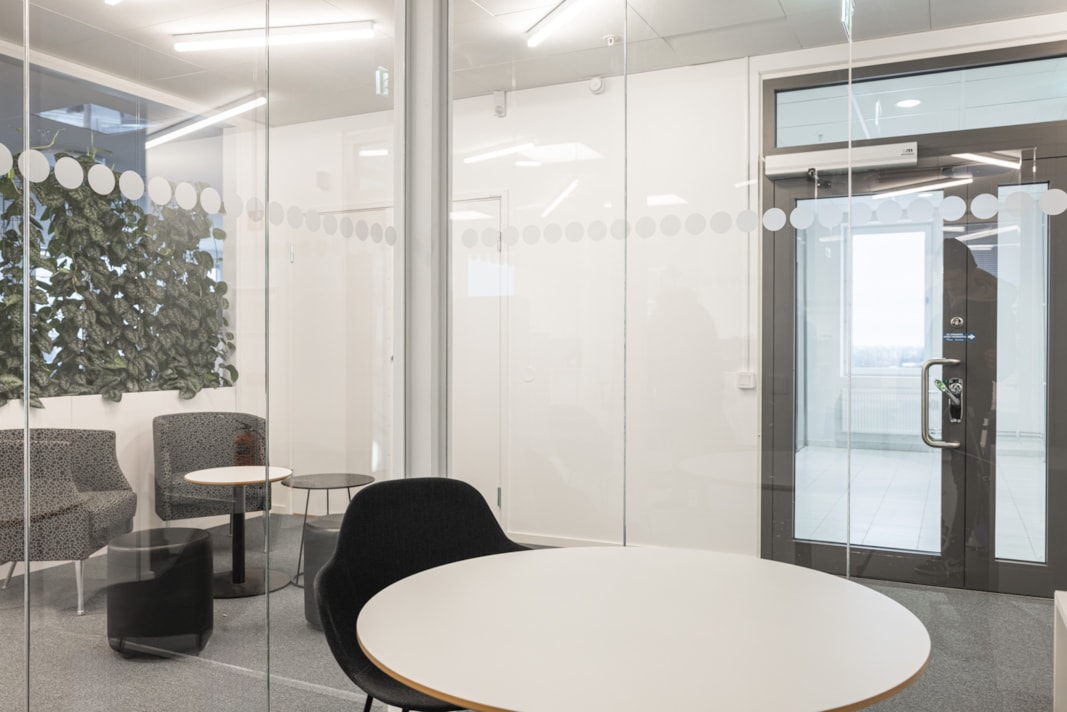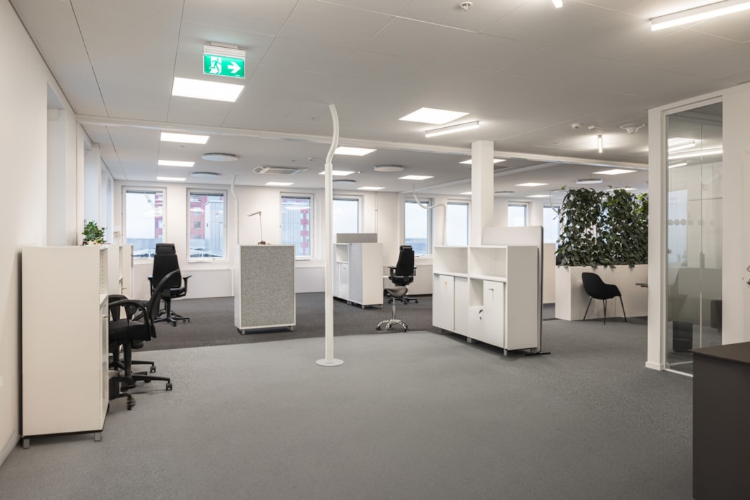 Välkommen till en arbetsplats där stora, imponerande fönster omfamnar varje väderstreck och släpper in ett flödande ljus som skapar en känsla av rymd och öppenhet.