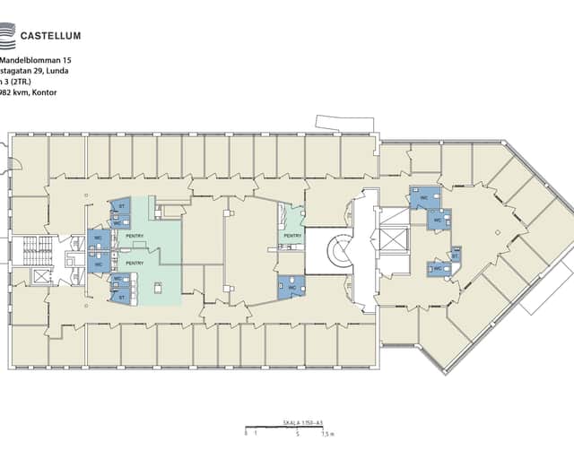 Ett större kontorsplan med generösa ytor, flera pentryn och WC-grupper. Planlösningen ger möjlighet till både öppna kontorslandskap och rumsindelade lösningar. Lämpligt för större organisationer eller utbildningsverksamhet.