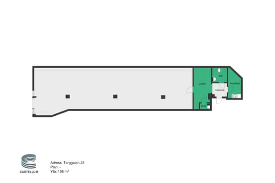 Rymlig takhöjd och stor öppen yta, förråd och pausyta. Generösa stora skyltfönster mot Stora Torget.