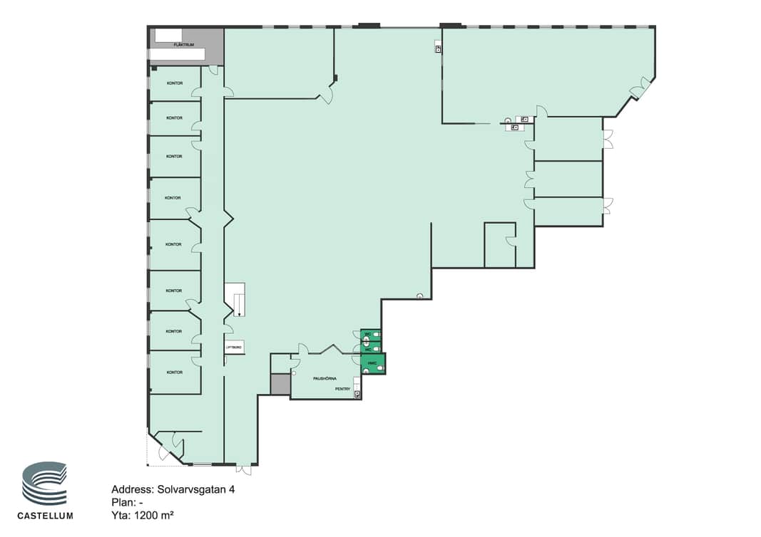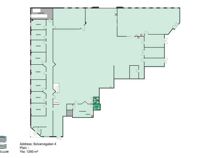 Lokalen erbjuder idag en öppen yta med, flertal kontorsrum, pausrum med pentry samt flertal wc. Möjlighet att dra in pallar i lokalen via separat entré.