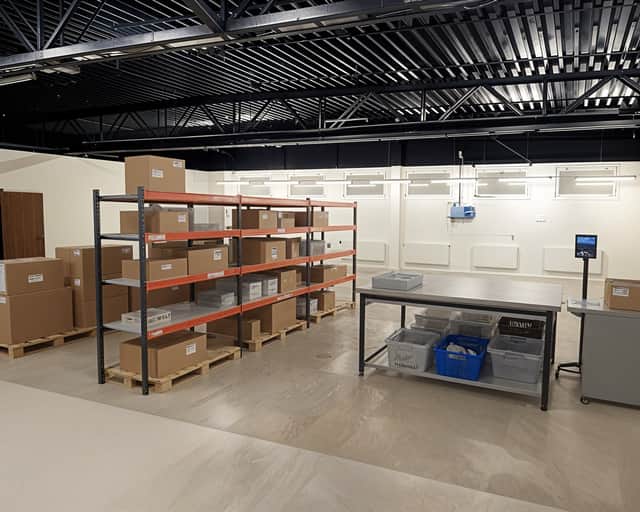 Enskilda kontorsrum, pentyr, omklädningsrum med dusch och stor öppen lageryta.