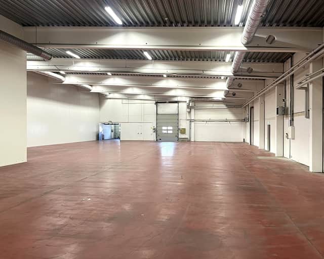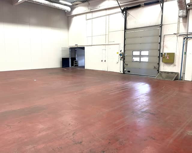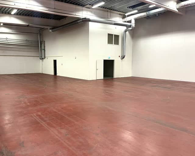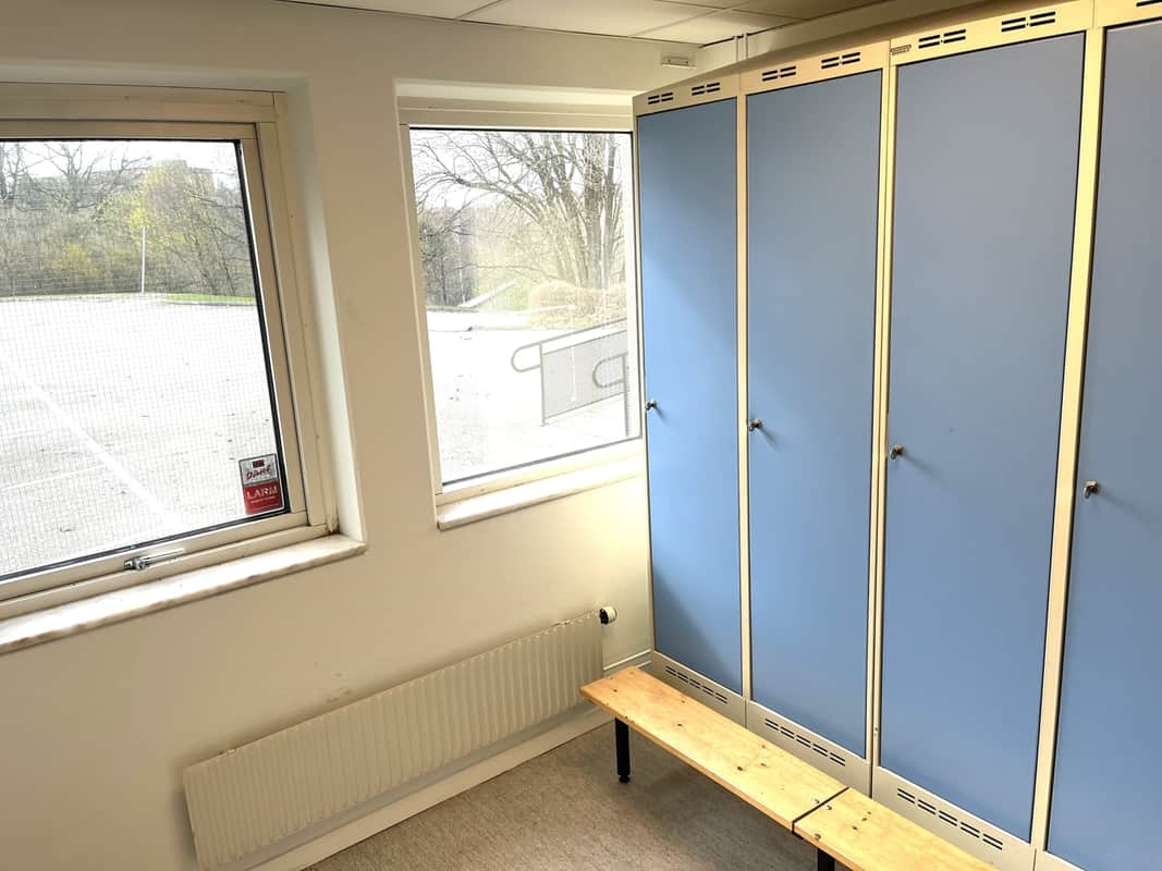 Utöver lagerdelen finns ett kontorsrum, omklädningsrum med dusch, wc och pentry.