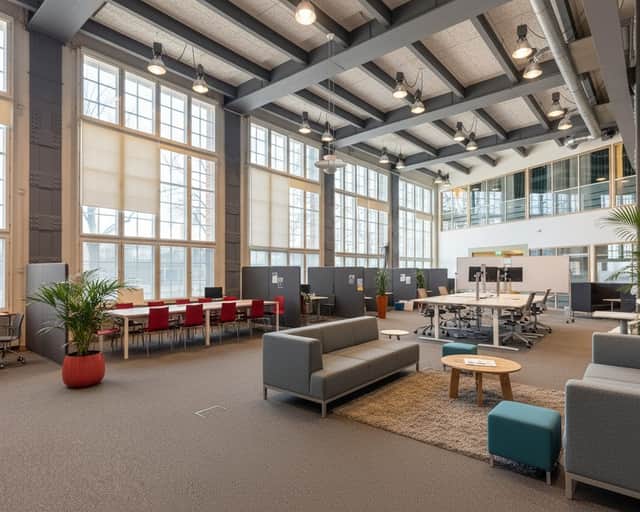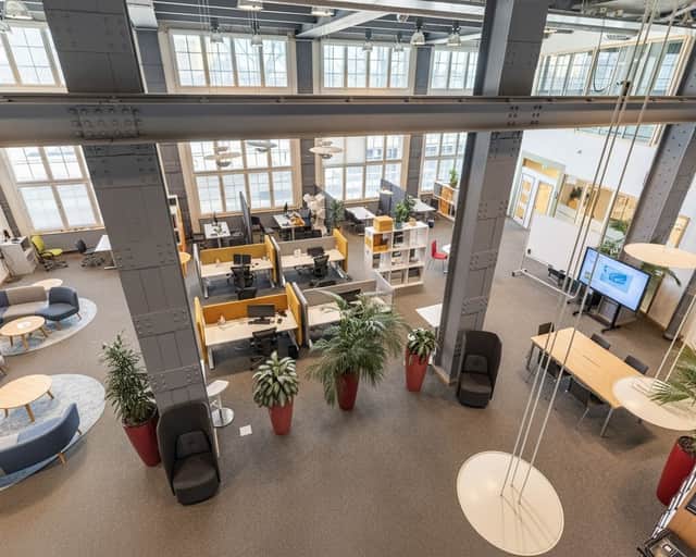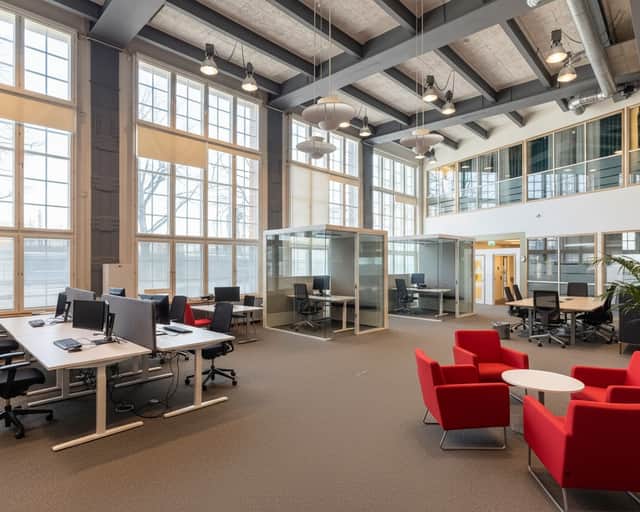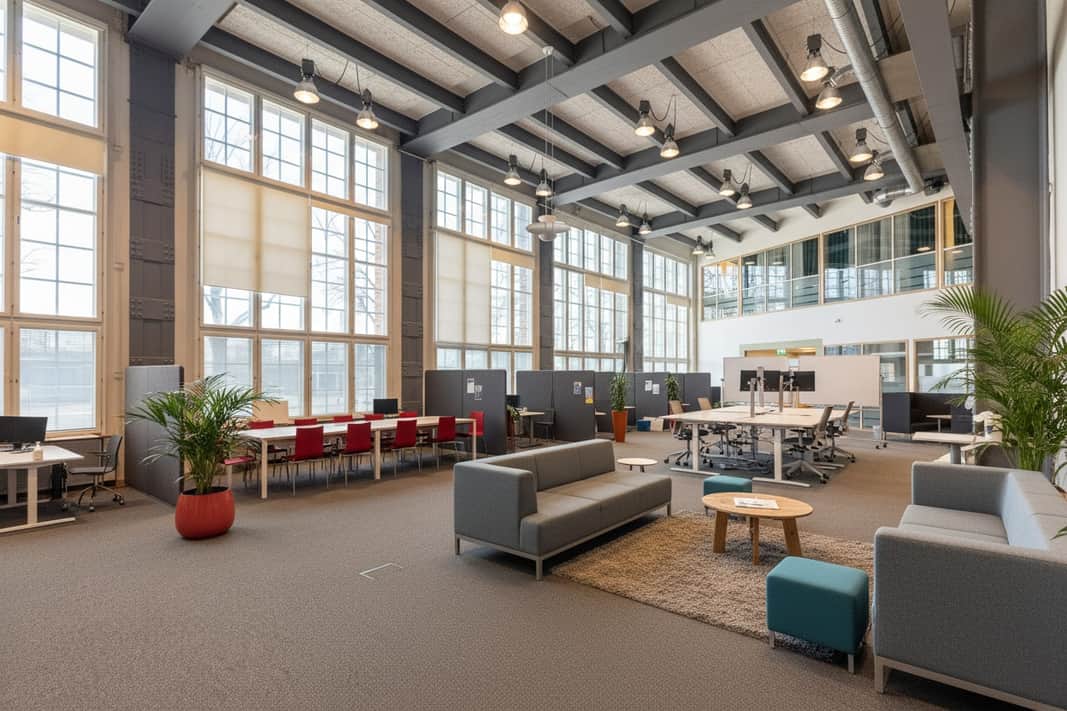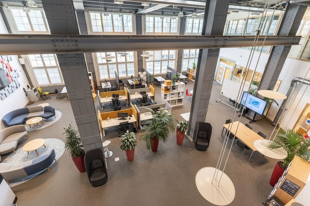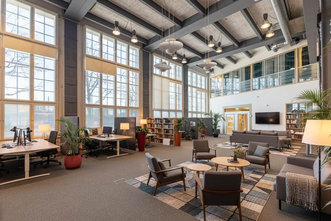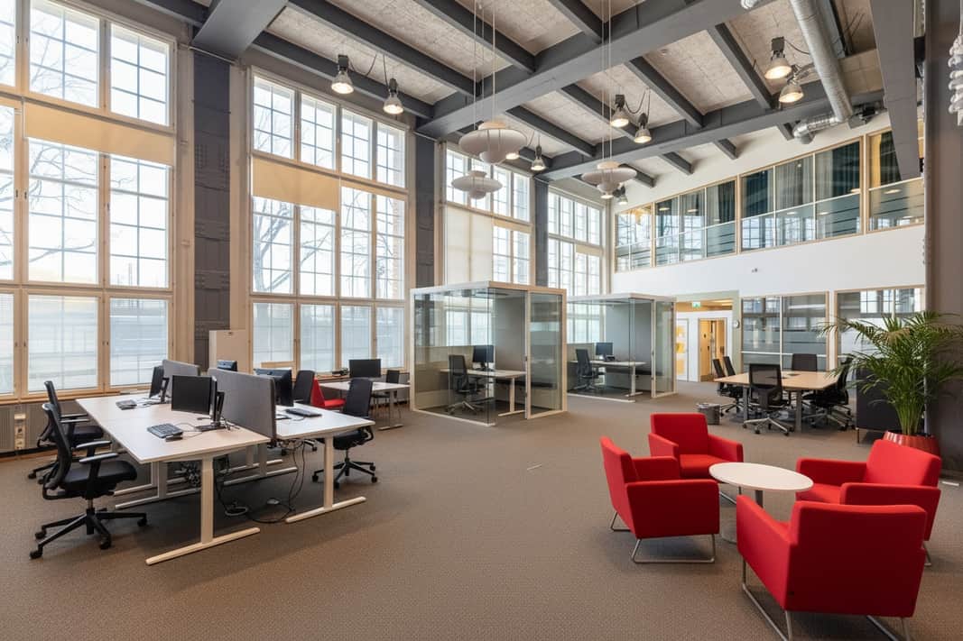 Den moderna interiören möter den vackra industrikaraktären från byggnadens historia. Resultatet är en lokal som utstrålar seriositet, stabilitet och kvalitet – egenskaper som passar er verksamhet perfekt.