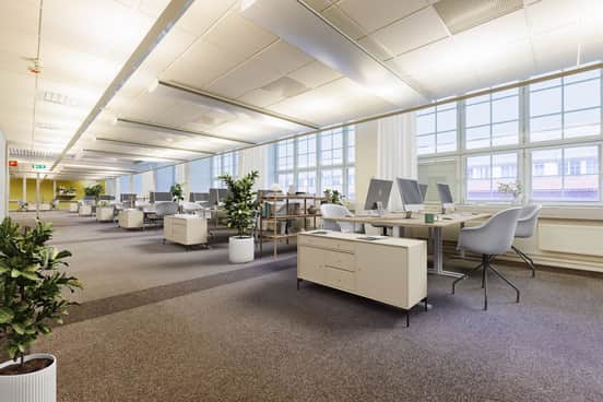 Lokalen har en öppen och flexibel planlösning som är uppdelad i två större rum, vilket ger gott om utrymme för både samarbete och individuellt arbete. Kombinationen av öppna ytor och stora rum gör det enkelt att anpassa lokalen efter verksamhetens behov, oavsett om ni söker sociala ytor, projektzoner eller kreativa arbetsplatser.
