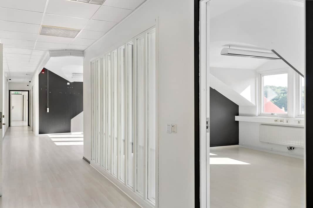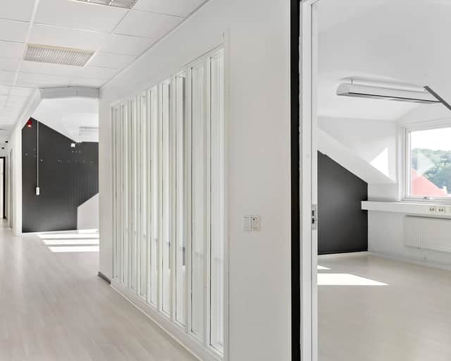 Välkommen till detta charmiga kontor som erbjuder en unik arbetsmiljö. Här uppe i takvåningen hittar du härligt snedtak och stora fönster som släpper in rikligt med dagsljus, vilket skapar en inspirerande och trivsam atmosfär för både medarbetare och besökare.