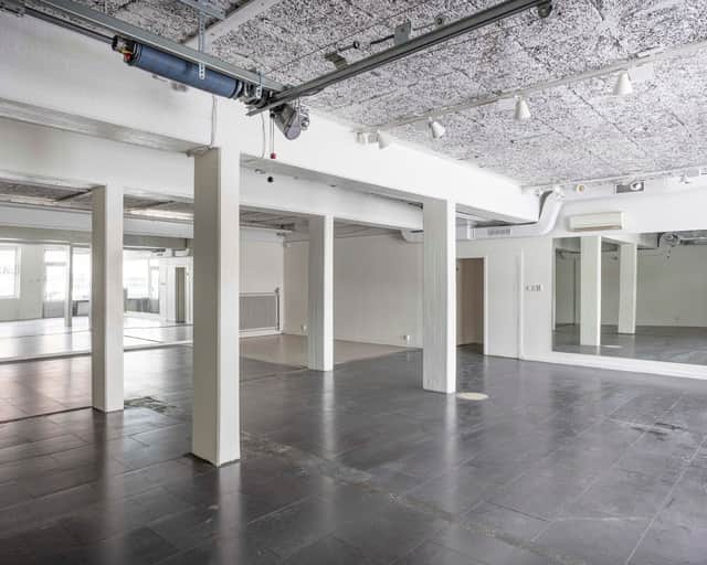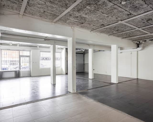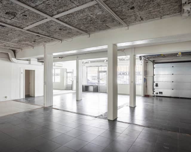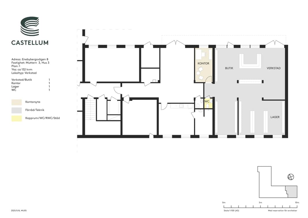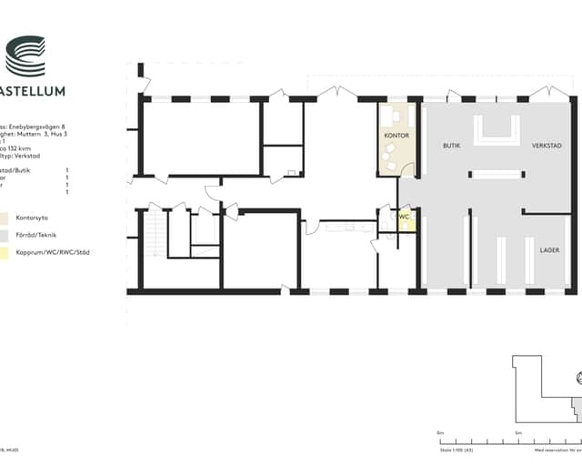Lokalen består av en öppen butiksdel i anslutning till ett kontor och en WC. Bredvid butiken ligger en större verkstadsyta, som i sin tur leder vidare till ett separat lager. Övriga rum och korridorer på vänster sida utgör gemensamma ytor som trapphus och teknikrum.