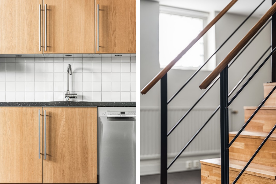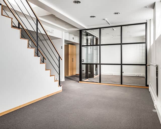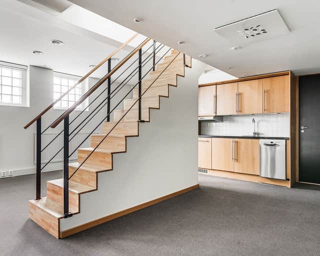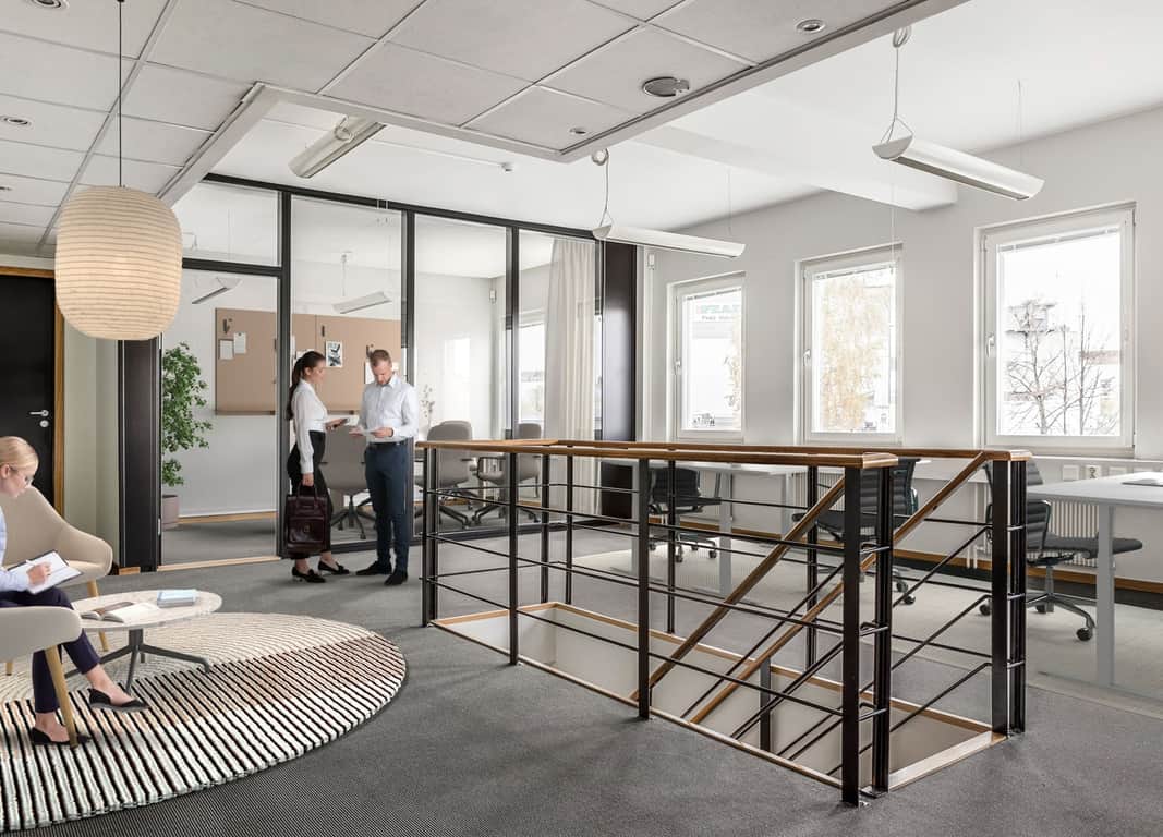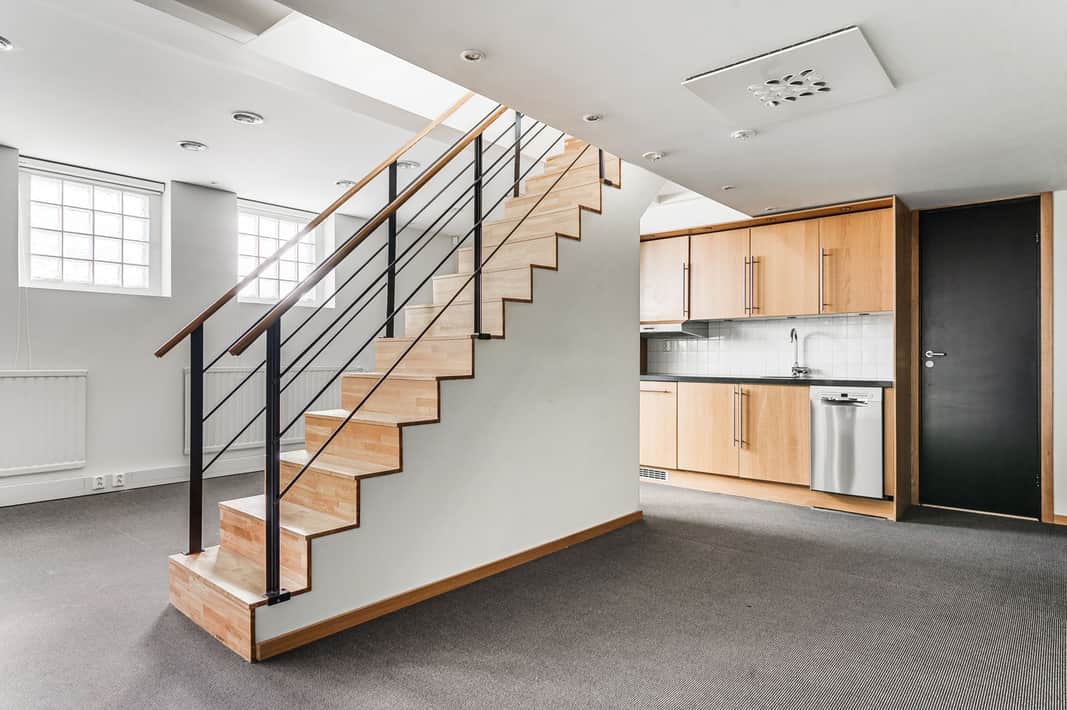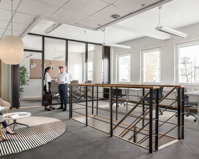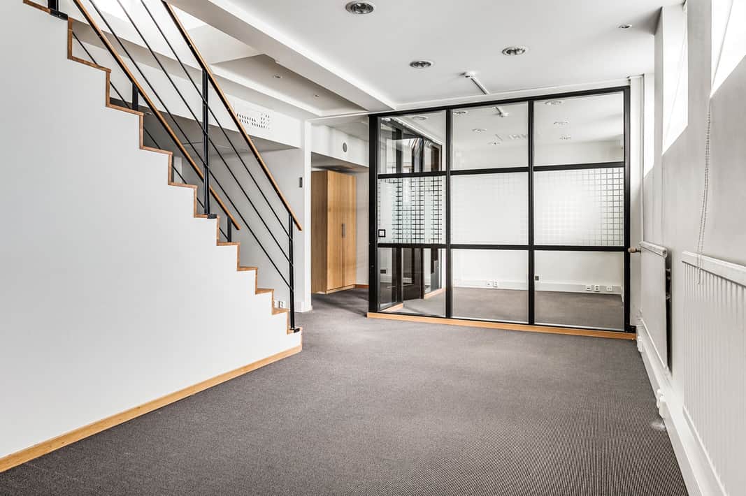 Lokalen har fint ljusinsläpp och nya ytskickt. Kontorets planlösning består av öppen arbetsyta, kontorsum, förråd, omklädningsrum och bastu.