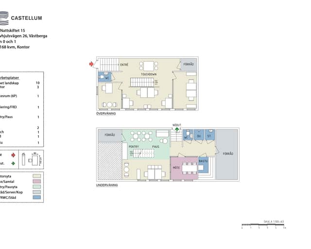 Entréplanet innehåller pentry och pausyta som fungerar som en naturlig samlingspunkt, samt mötesrum, WC, dusch, bastu, städutrymme och lager. Övervåningen rymmer huvudsakligen arbetsplatser, touchdown-yta samt server- och kopieringsutrymme.
