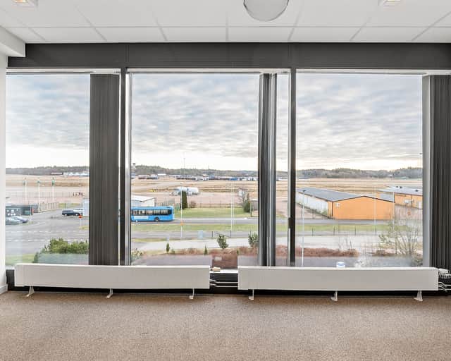 Ljust och trevligt kontor men stora fönster ut mot landningsbanan.