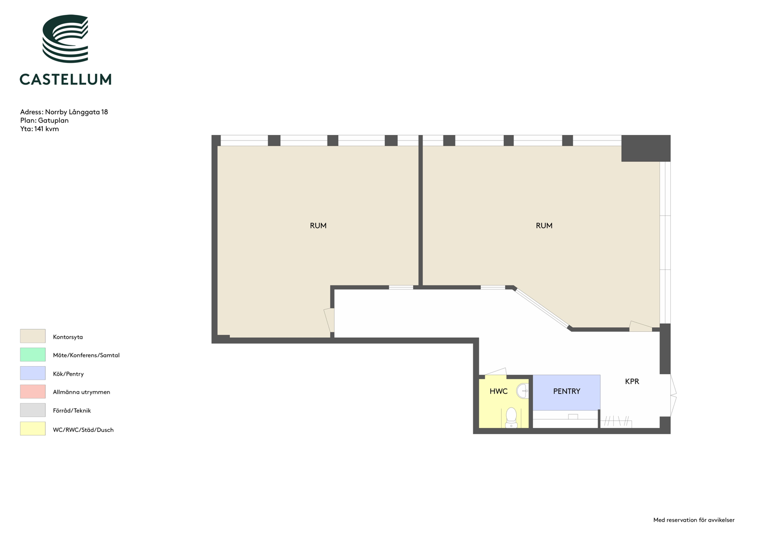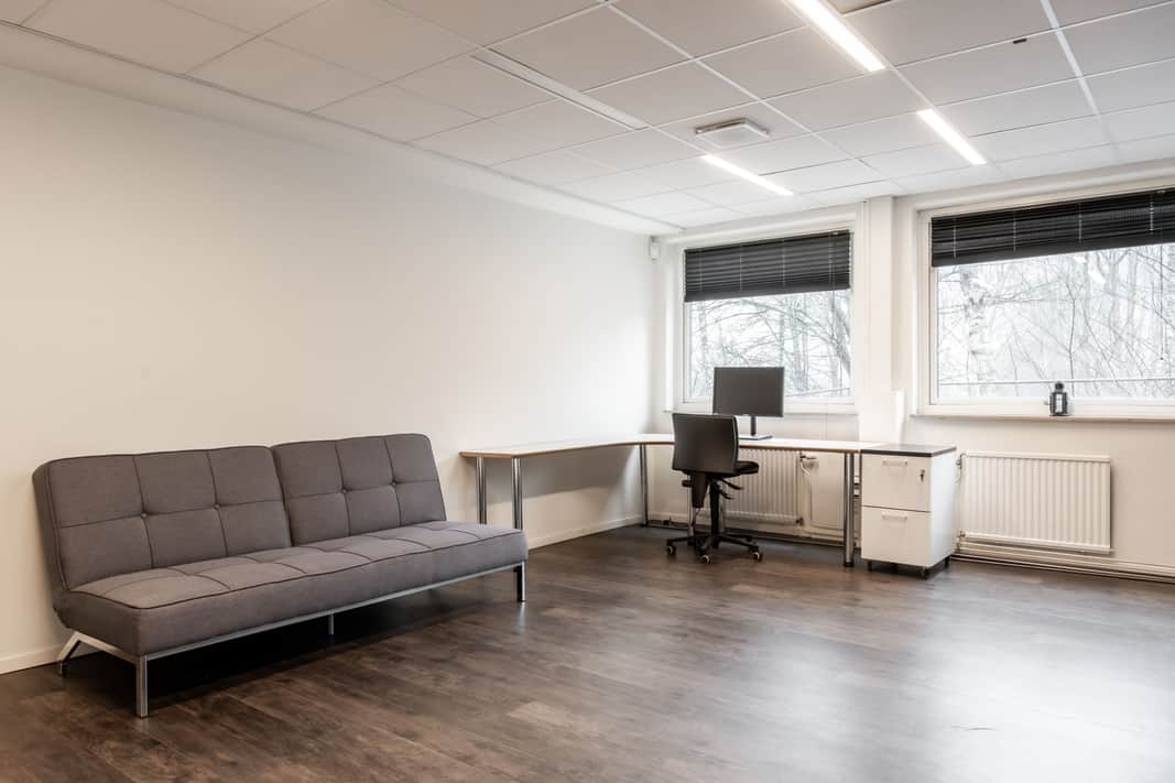 Två stora öppna rum, pentry och WC. Stora fönster
