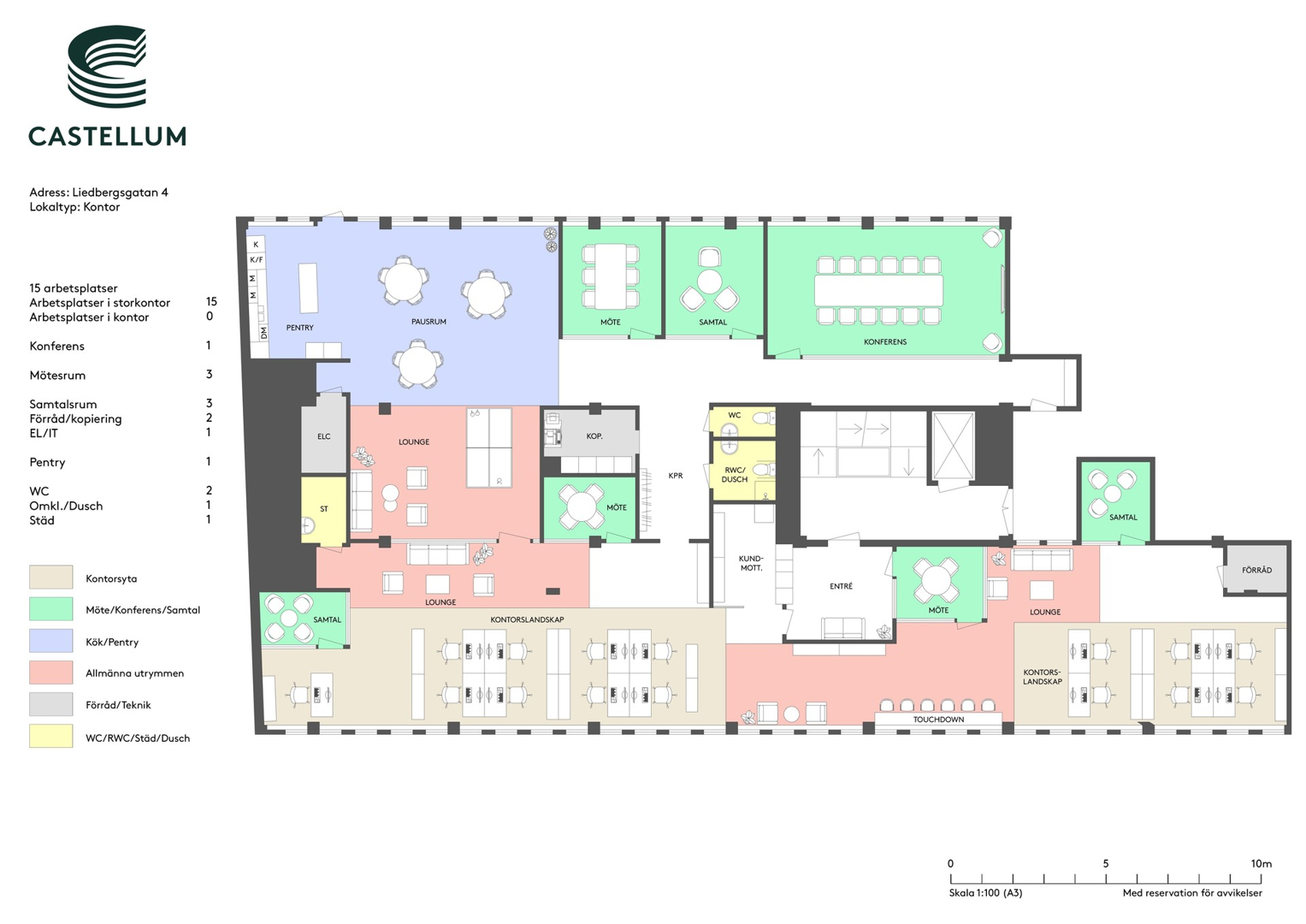 Varierad planlösning som erbjuder både arbetsplatser i öppet landskap som med enkelhet kan delas in i olika ljudzoner. Mötesrum i varierande storlekar för att täcka alla behov samt rymligt pentry och pausyta vilket drar upp trivselfaktorn ytterligare. Praktiska bekvämligheter som två entreér, kopieringsrum, städskrubb, kapprum och två toaletter, varav en rwc med dusch.