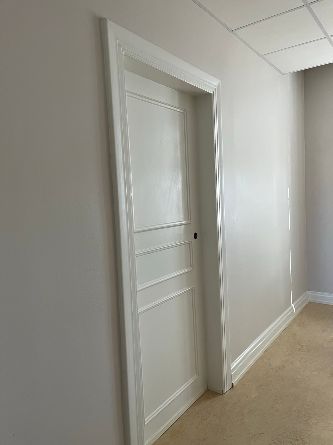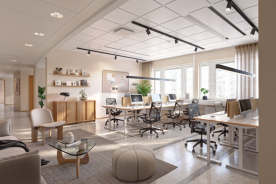 Kontoret består av 5 kontorsrum samt 2 större rum för konferens/kontor. Alla rum har fint ljusinsläpp av de stora fönsterna. Beroende på verksamhet så finns det arbetsplatser för 10–20 personer.