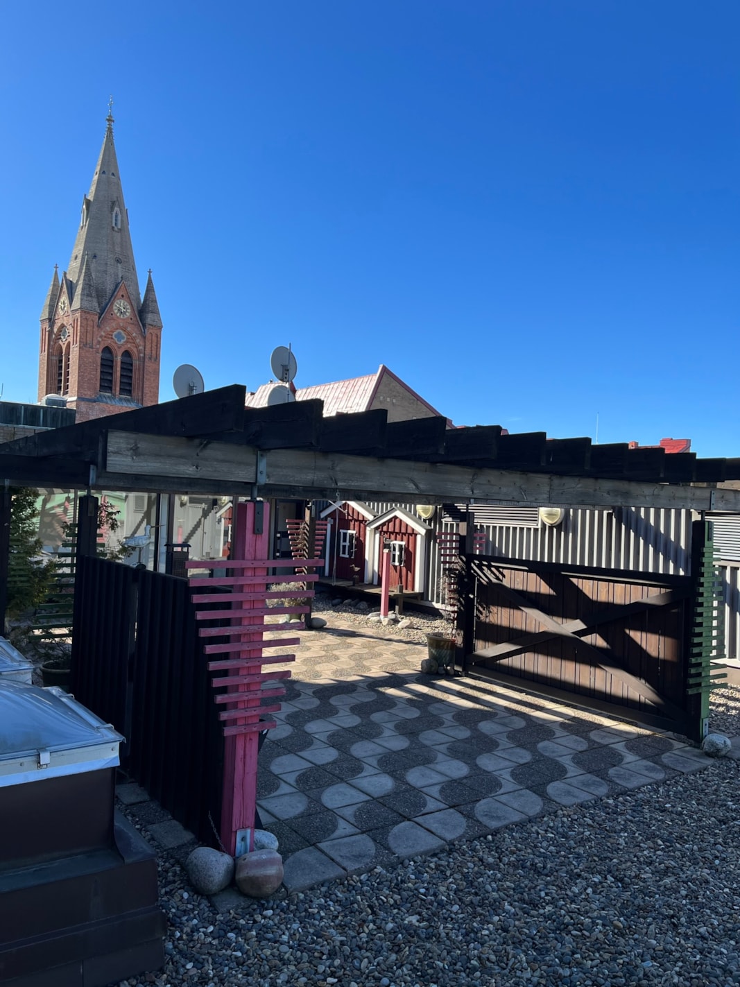 Högst upp i huset finns en gemensam takterrass med utsikt över innergården och takåsarna, perfekt för en fikapaus i solen.