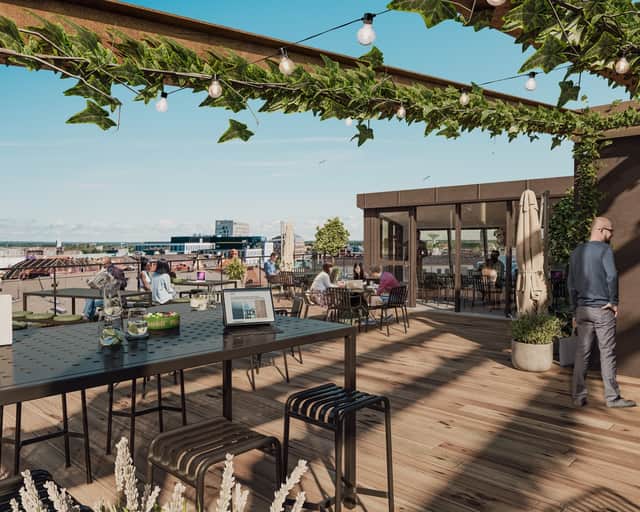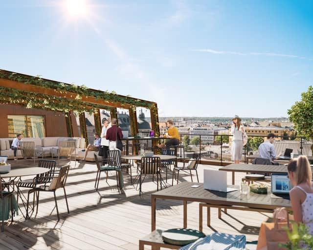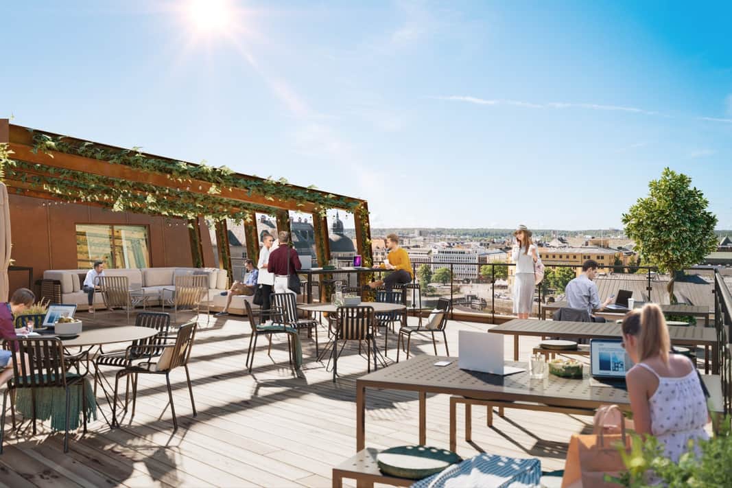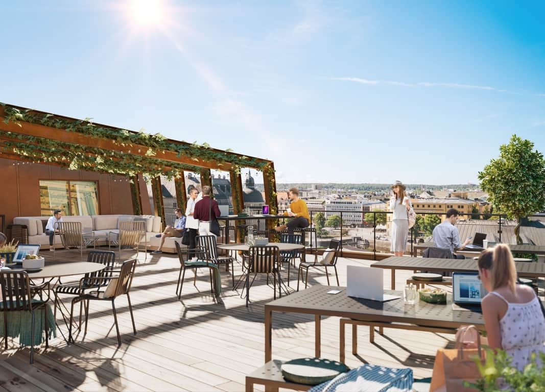 Utsikten är en optimerad arbetsplats med nya möjligheter. Högst upp i huset finner du gemensamma sociala ytor. Takterrassen har plats för både utomhuskontor och återhämtning och erbjuder en av stadens vackraste utsikter.