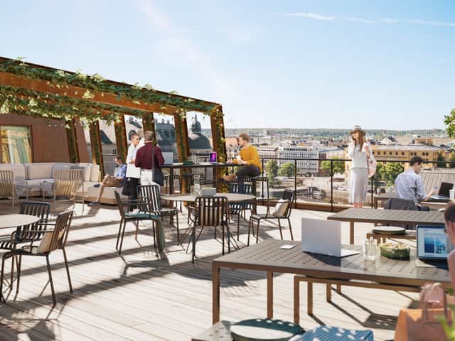 Utsikten är en optimerad arbetsplats med nya möjligheter. Högst upp i huset finner du gemensamma sociala ytor. Takterrassen har plats för både utomhuskontor och återhämtning och erbjuder en av stadens vackraste utsikter.