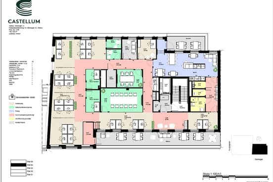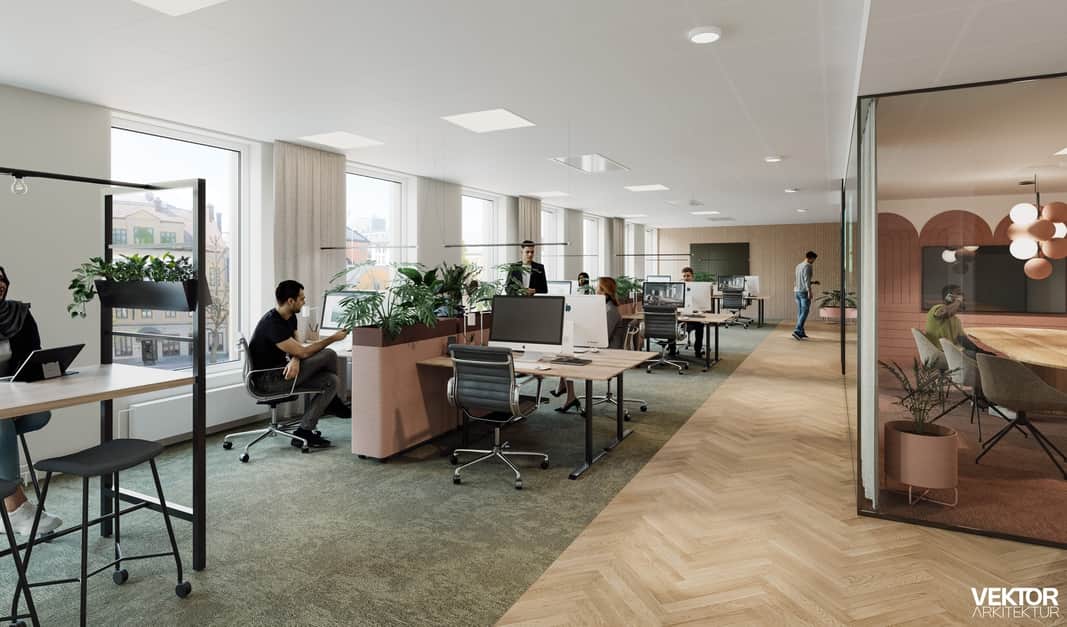 Kontoret anpassas efter hyresgästens önskemål. Här kan till exempel ett öppet kontorslandskap kombineras med tysta kontor och konferensrum.