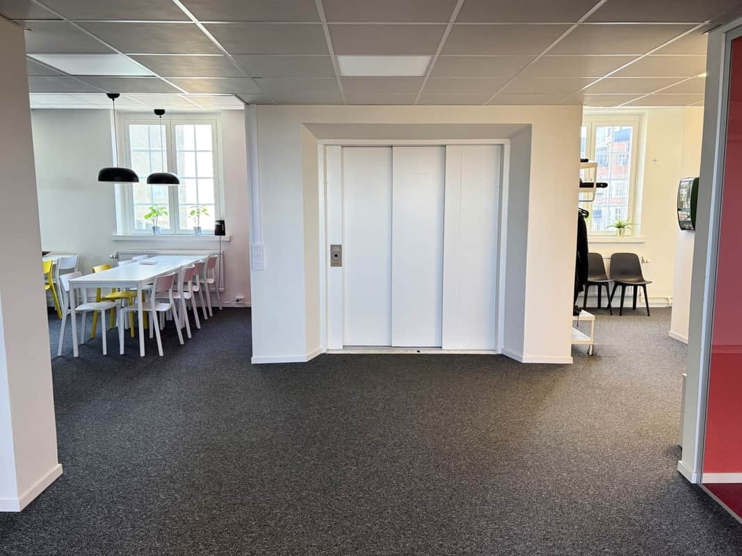 Ni kommer in i lokalen direkt från hissen och möts av en stor öppen yta. I dagsläget öppnar entrén upp till pausrum, lounge och vardagsrum.