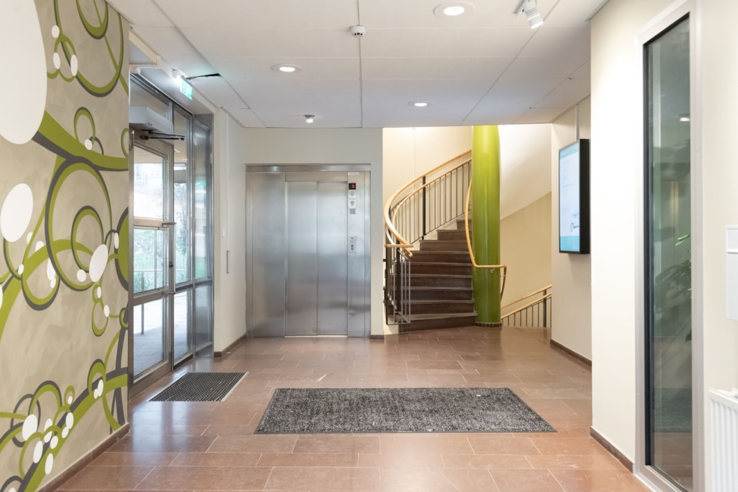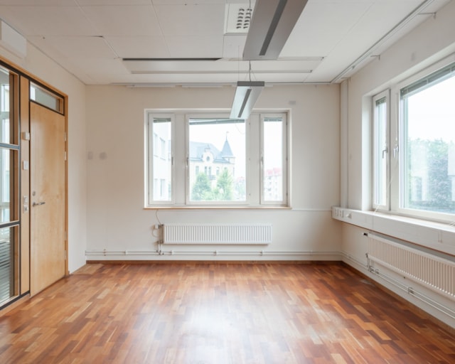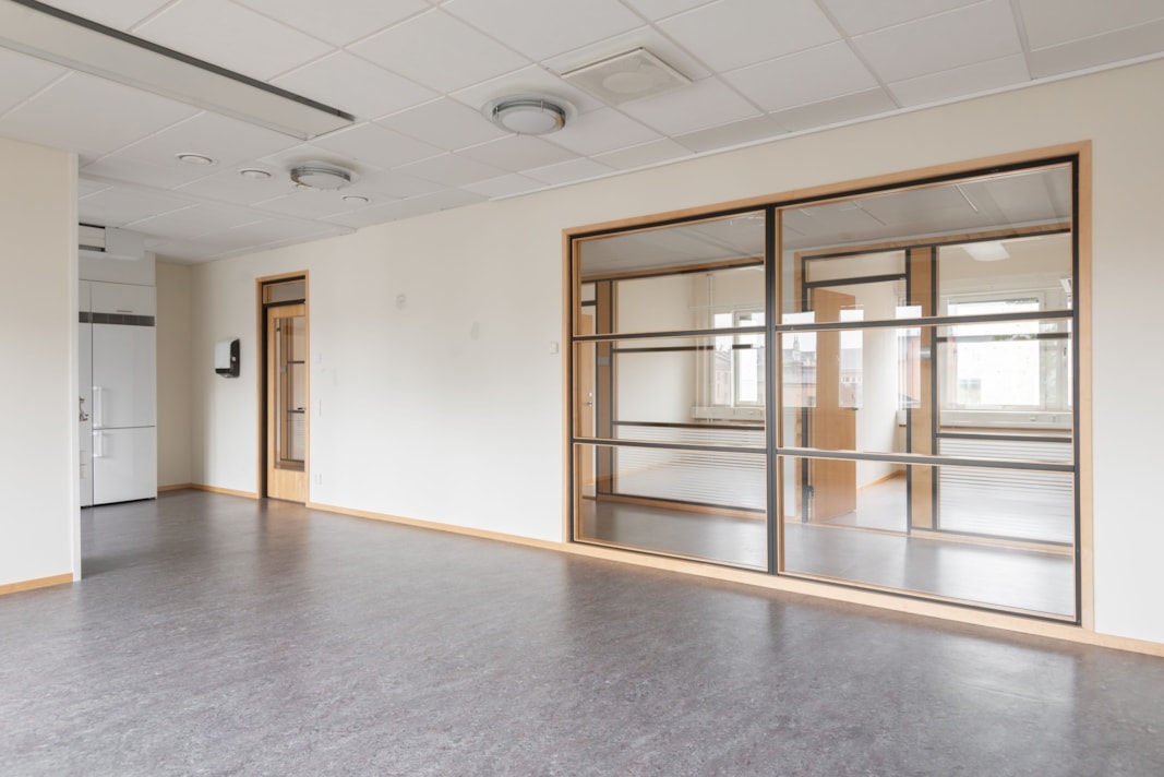 En yteffektiv lokal med mycket ljusinsläpp som anpassas efter behov och verksamhet. I nulägets planlösning finns det flertalet cellkontor, två mötesrum och ett lunchrum. Med fördel kan väggar slås ut därmed och skapa ett öppet kontorslandskap, aktivitetsyta eller större konferenskontor. Se visionsbild för exempel på hur det kan se ut! Om ni inte vill ta de vackra trapporna tre våningar upp så stannar hissen precis utanför entrén till lokalen.