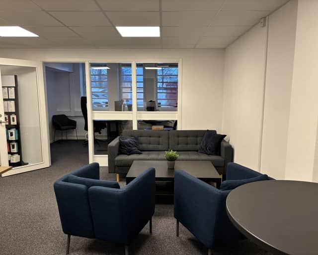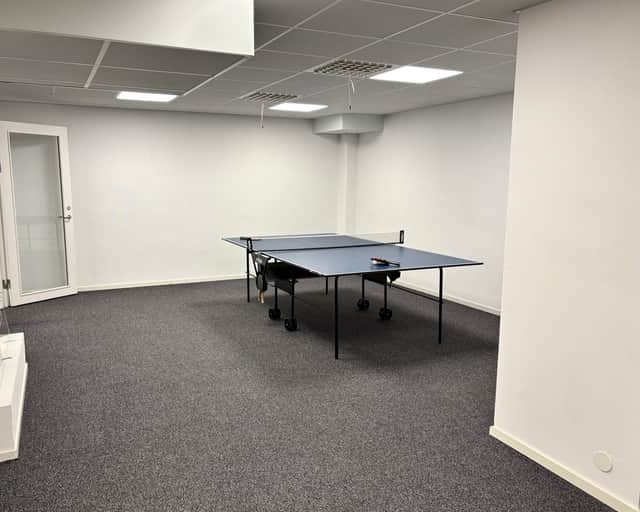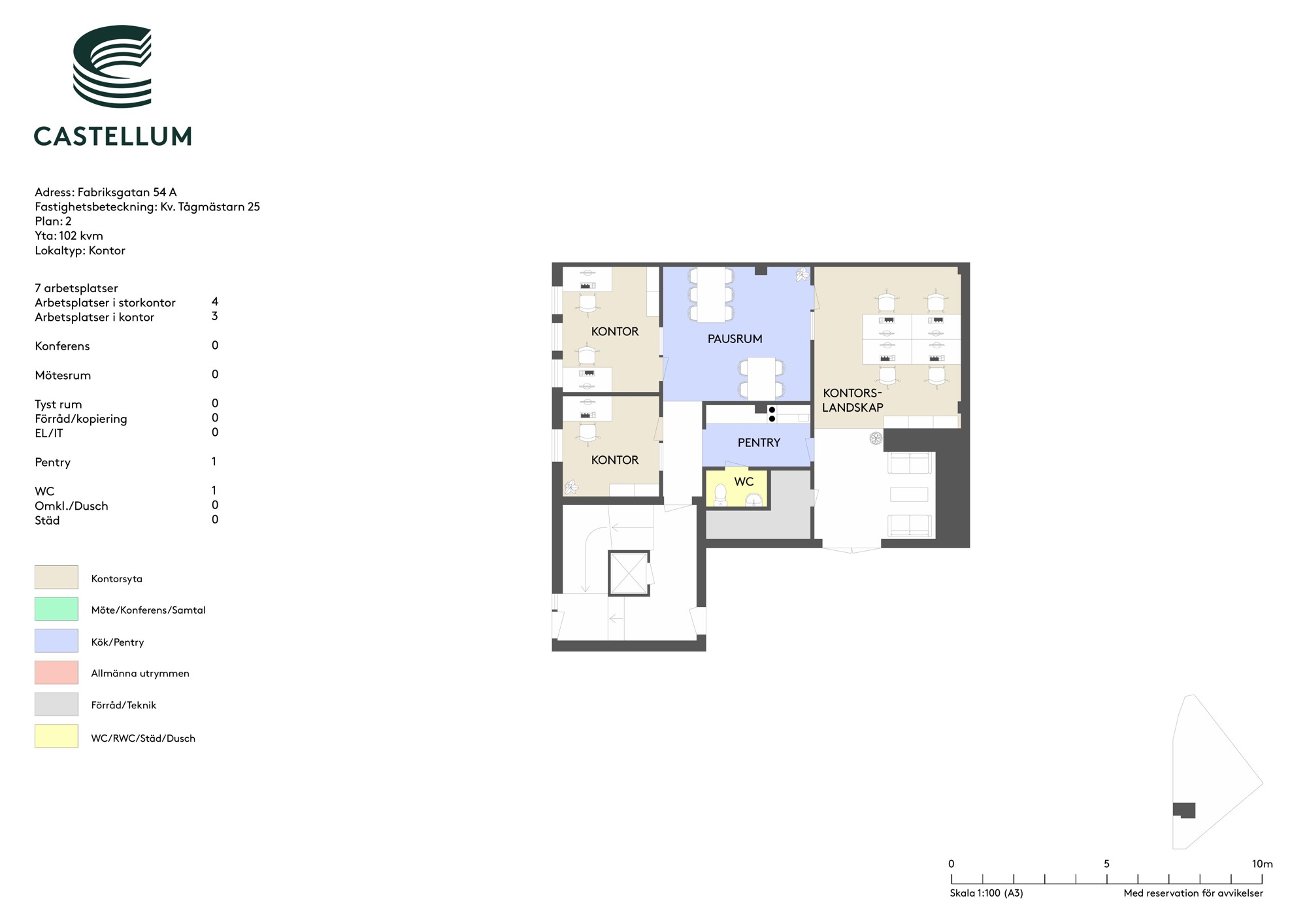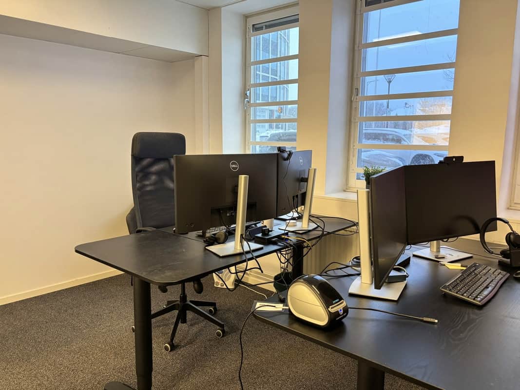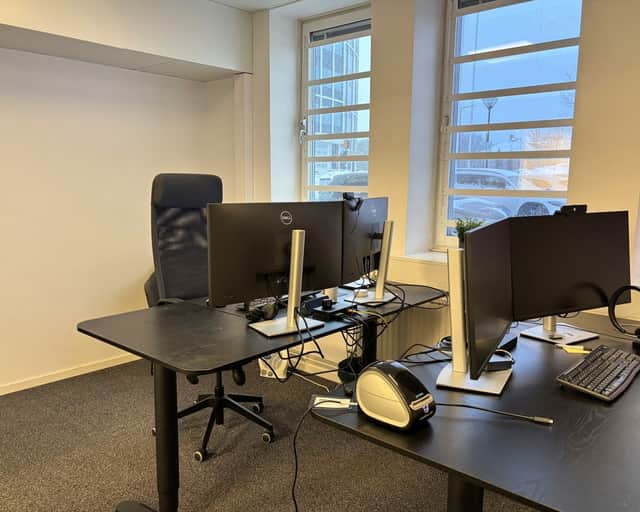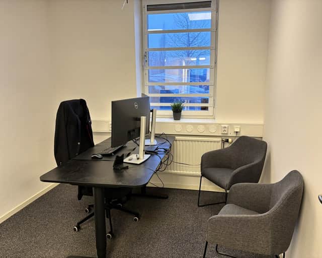Planlösningen är uppdelad och flexibel i sin utformning. Det finns två regelrätta kontor och en lite större yta, som kan användas till fler skrivbord, lagerplats eller varför inte som ett aktivitetsrum.