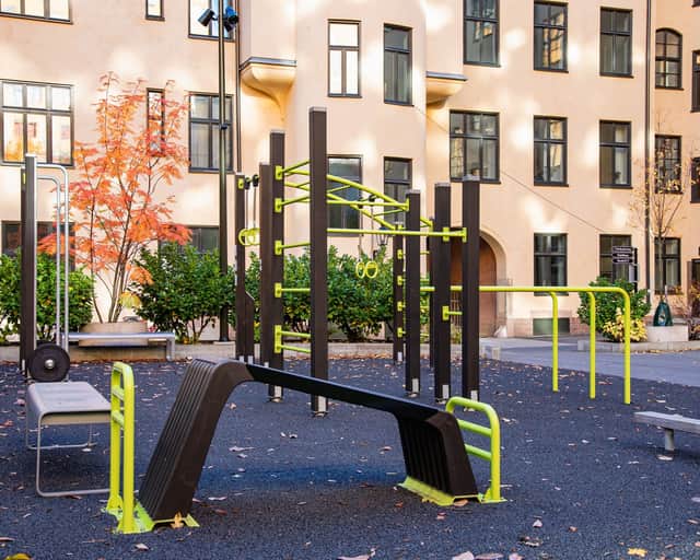 På de två grönskande innergårdarna kan du varva ner eller ägna dig åt träning. Förutom en padelbana, som bokas via court22.se, finns även ett utegym för den som föredrar andra träningsformer. Efter träningen kan du slå dig ner vid vårt utekontor – ett komplett kontorsutrymme under bar himmel, utrustat med WiFi, eluttag och ergonomiska arbetsplatser.