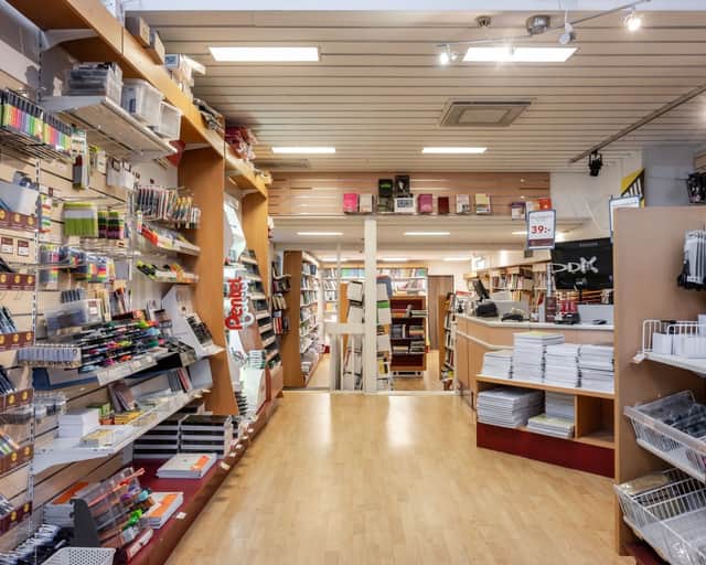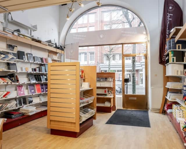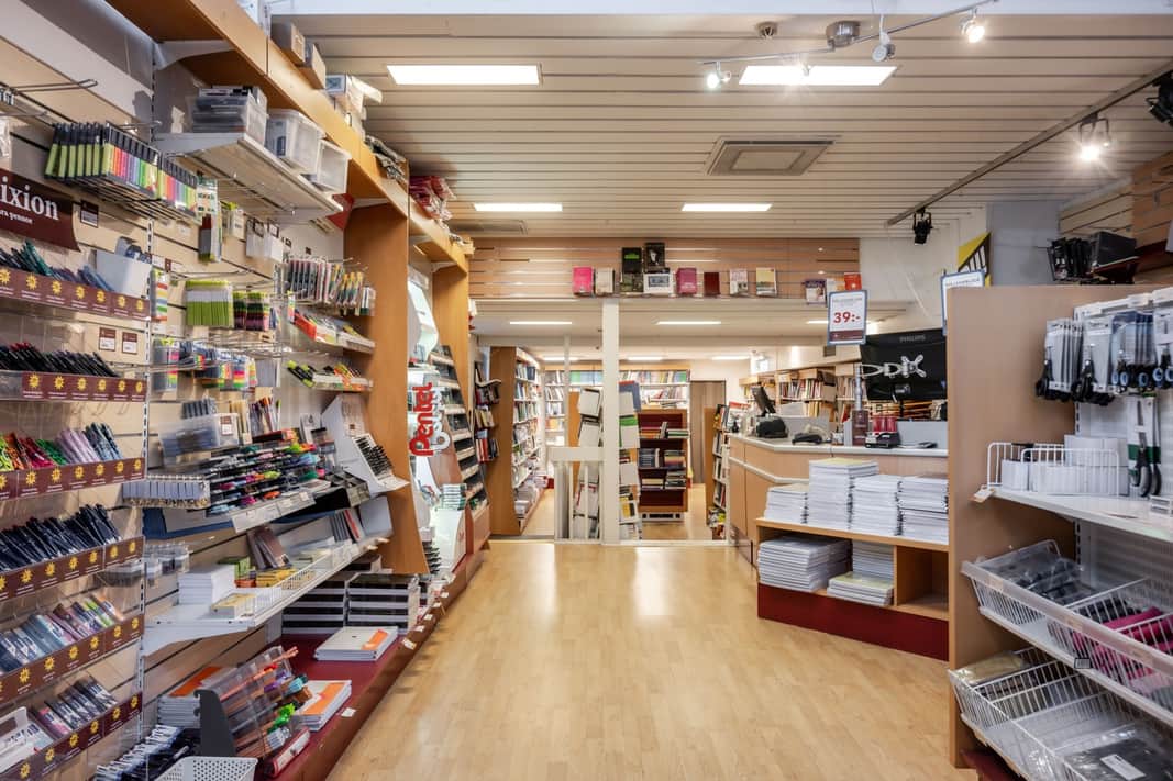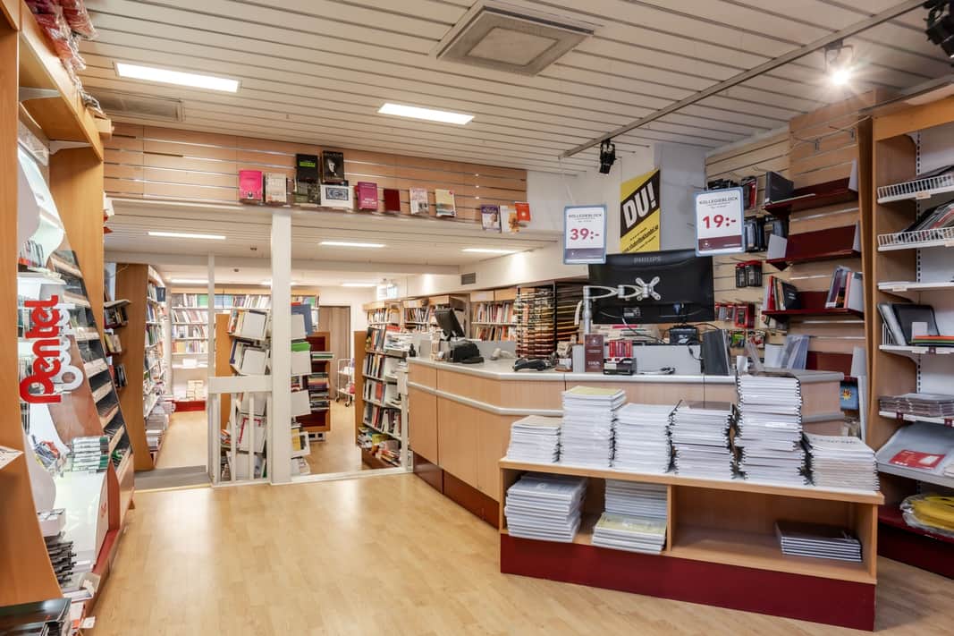 Öppen försäljningsyta med personalutrymme i bakkant av lokalen. Stora skyltfönster.