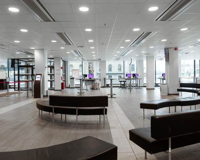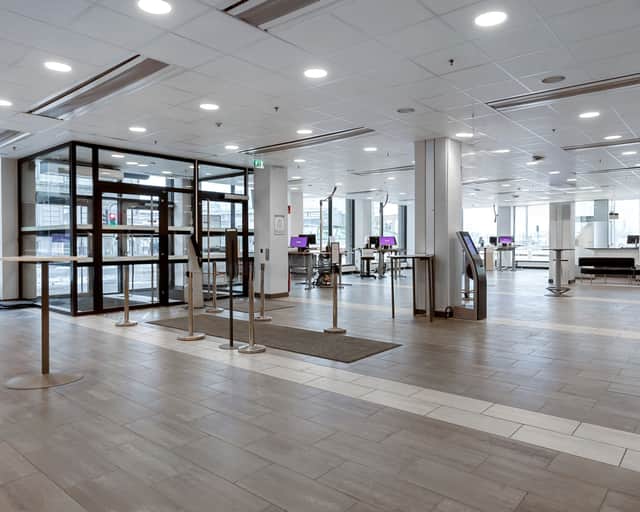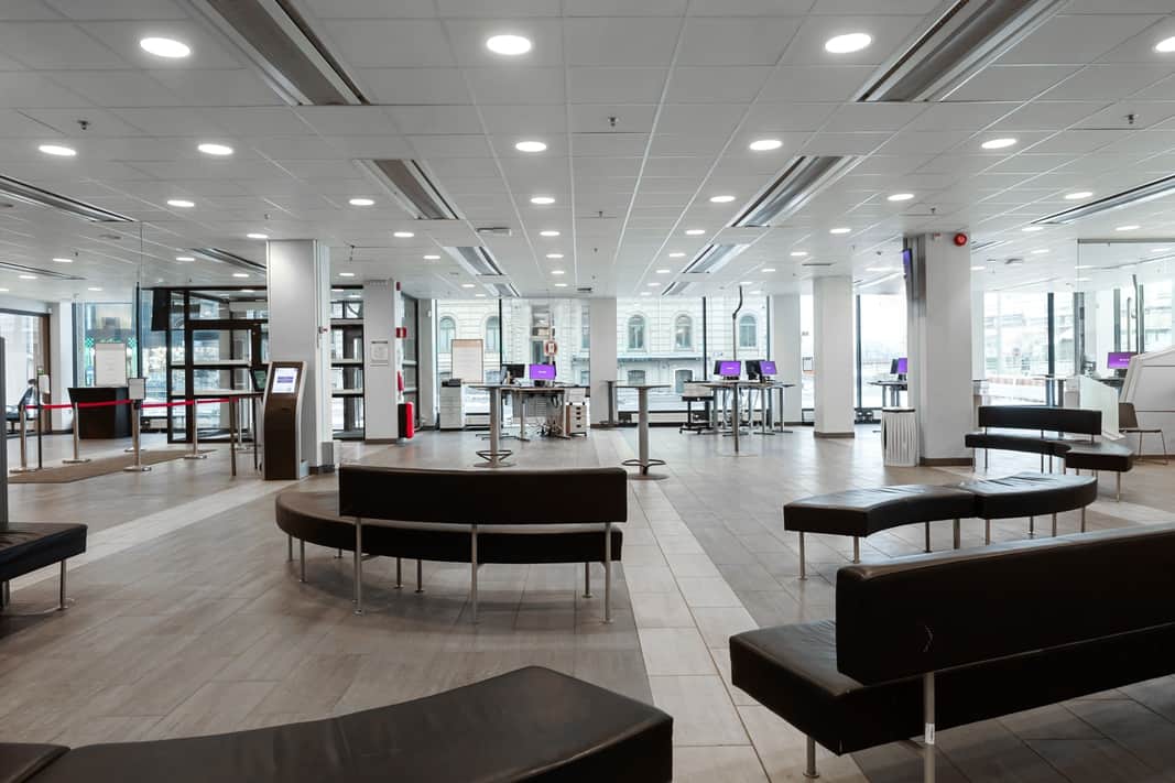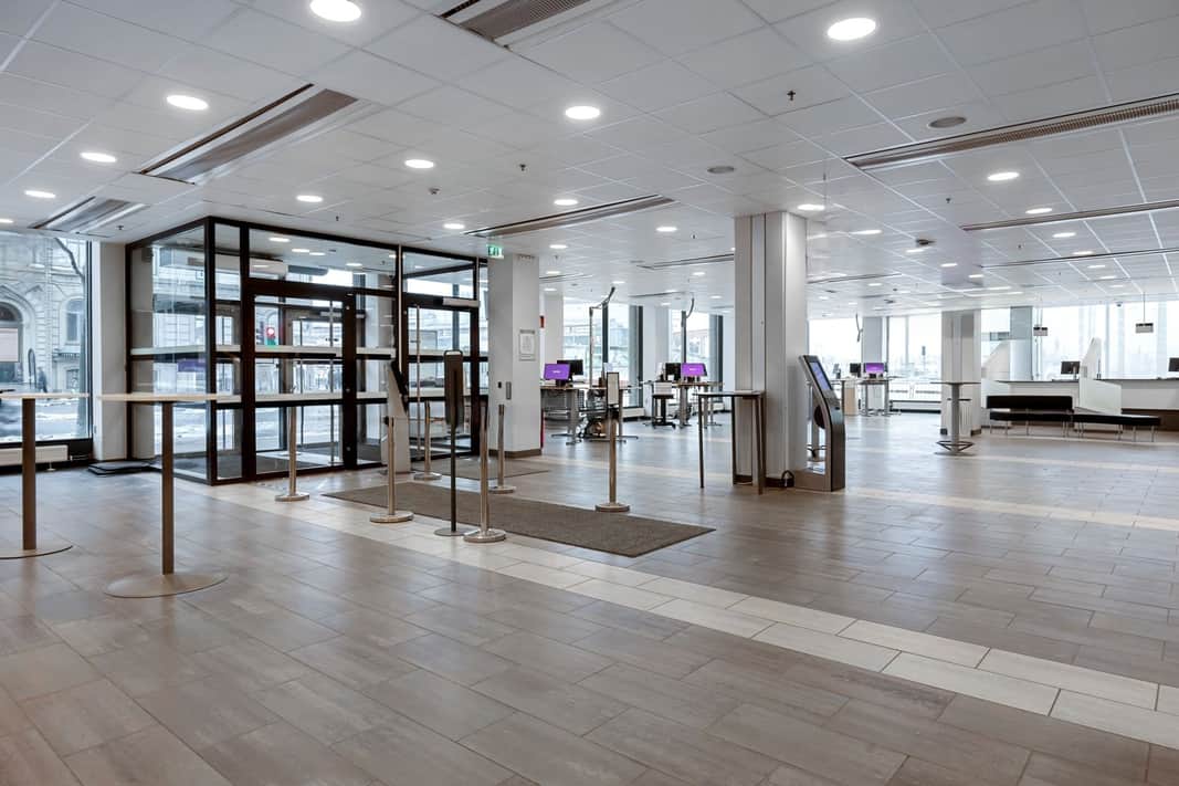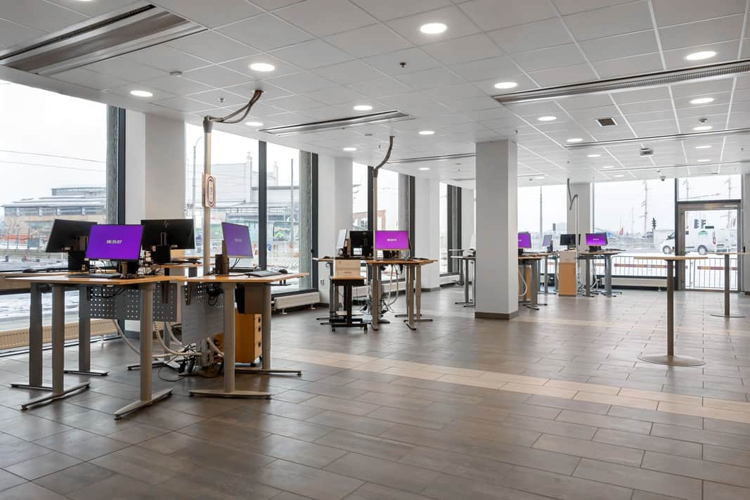 Stor öppen yta som kombineras med kontorsrum, mötesrum och personalutrymme.