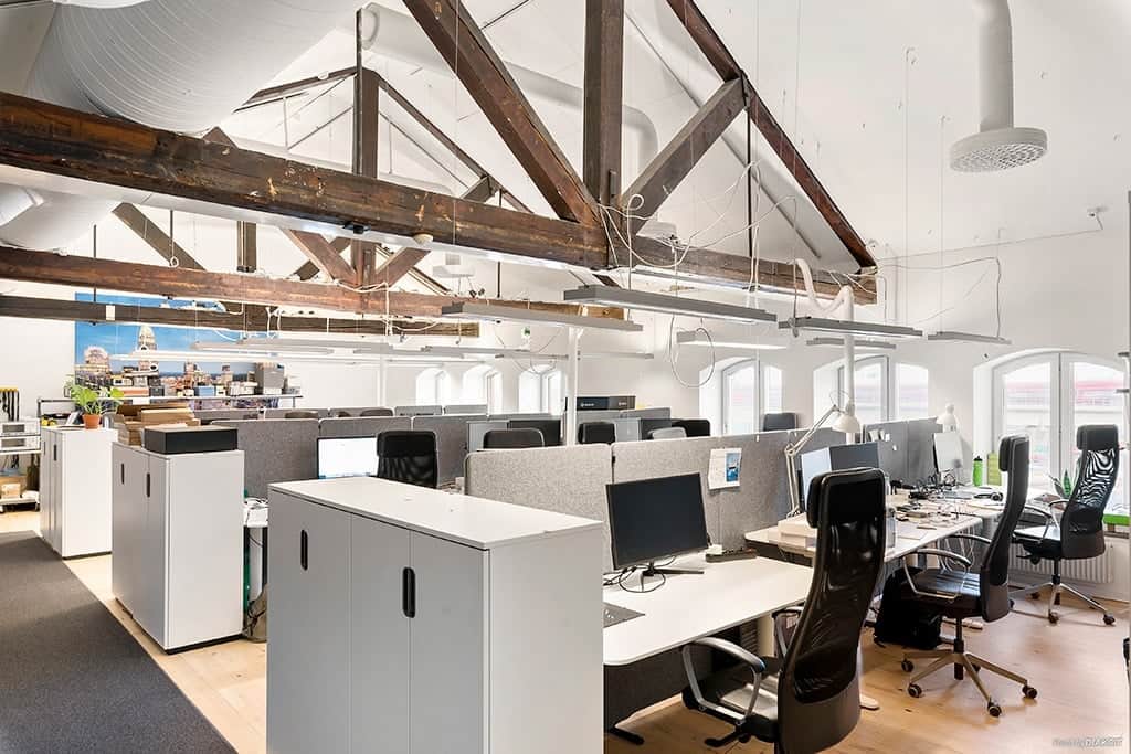 Lokalen ligger högst upp i fastigheten på plan 4 och erbjuder en charmig arbetsmiljö med tidstypiska detaljer såsom synliga takbjälkar i mörkt trä, imponerande takhöjd och stora vackra fönsterpartier som ger ett härligt ljusinsläpp i flera väderstreck. Lokalen har nyligen genomgått renovering och kombinerar den äldre karaktären med en modern och ljus känsla.