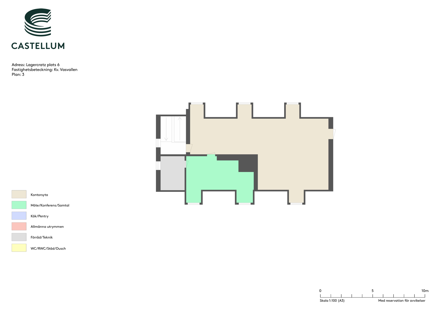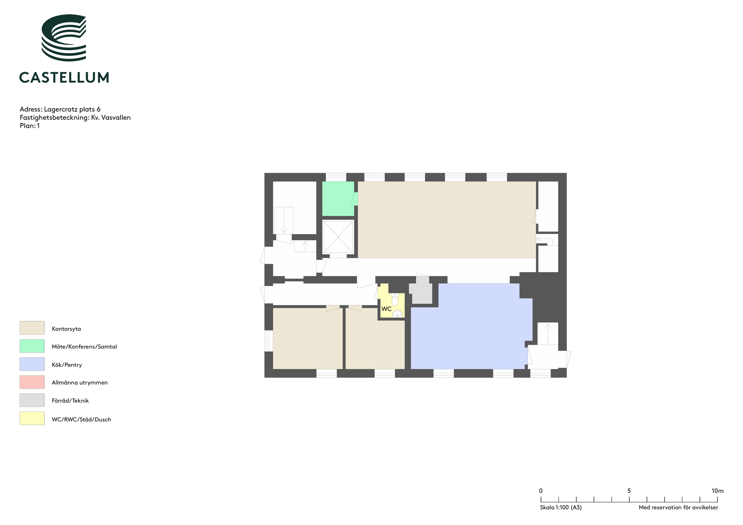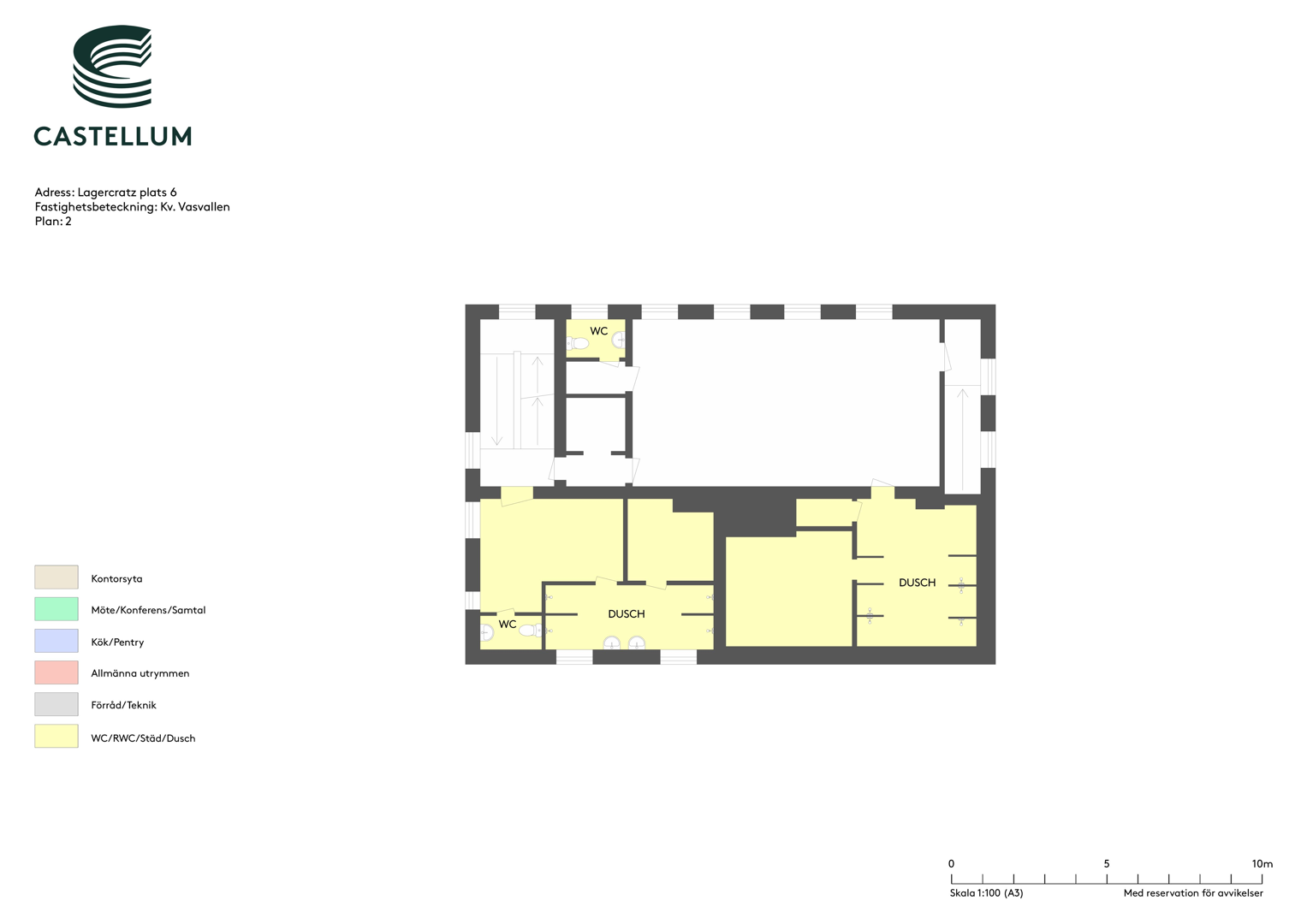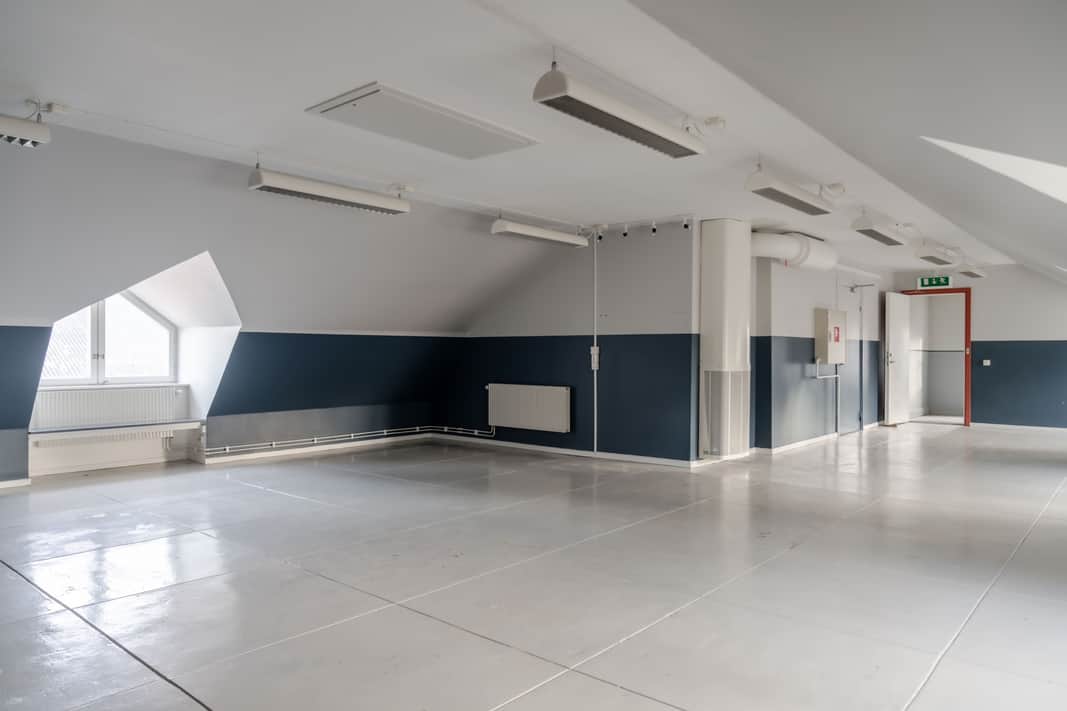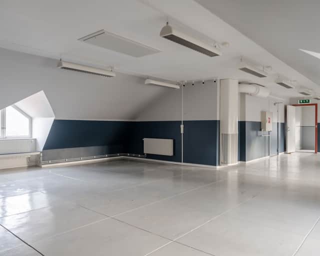 Planlösningen består av öppna ytor och kontorsrum samt omklädningsrum med bastu.