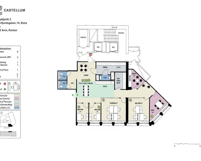 Pentry och lounge skapar en naturlig samlingspunkt för paus och informella möten, medan serverrum, kopiering och förvaring är praktiskt placerade för att underlätta vardagen. Två WC och städutrymme bidrar till en smidig och funktionell helhet.