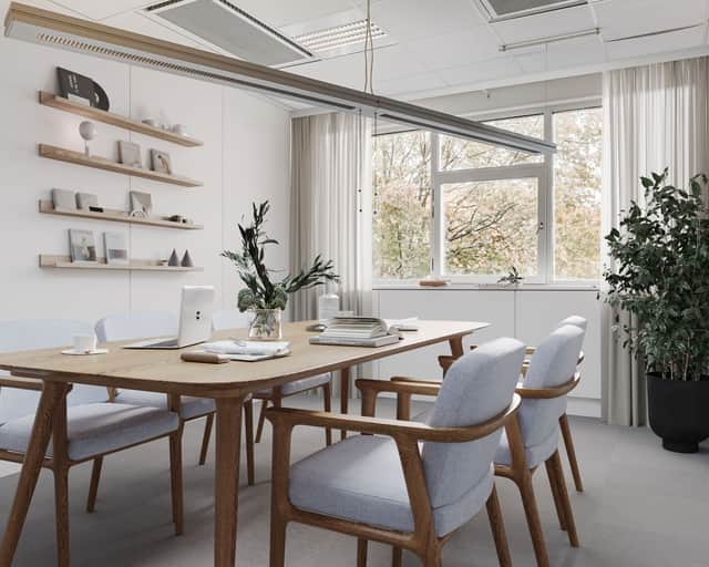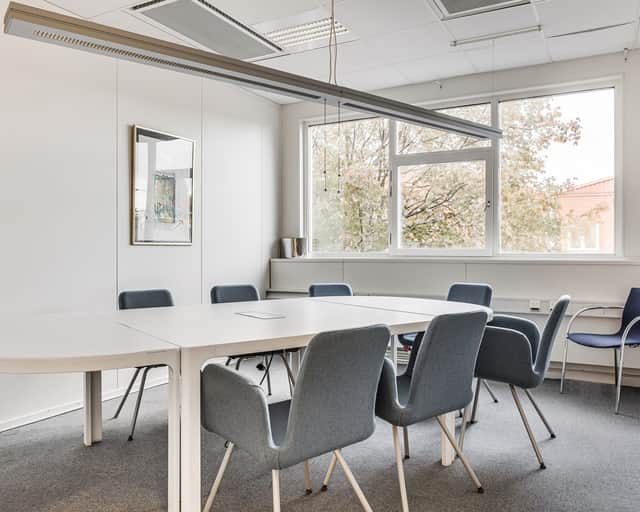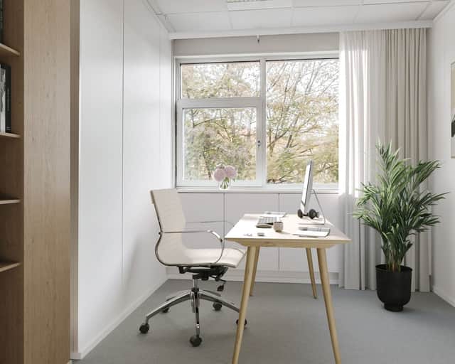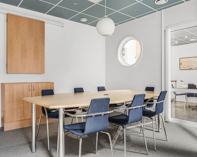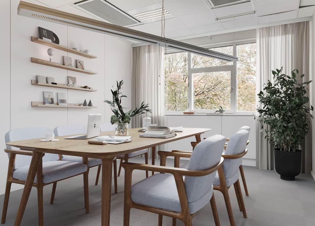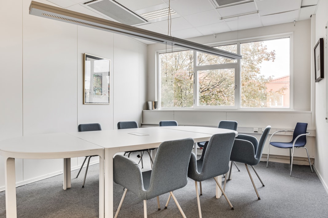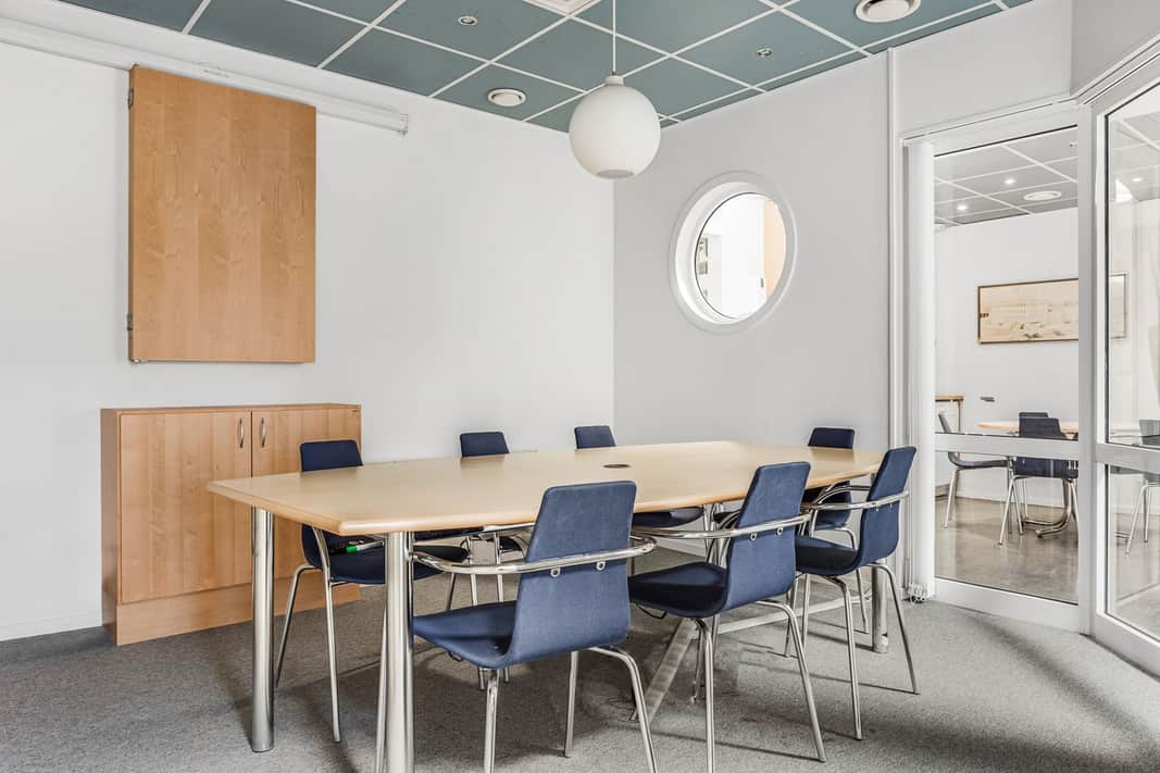 Planlösningen består av rumsindelade kontor, två mötesrum och ett pentry.