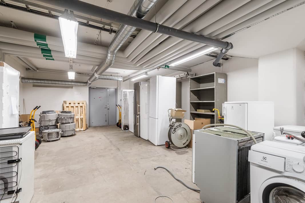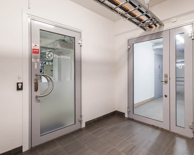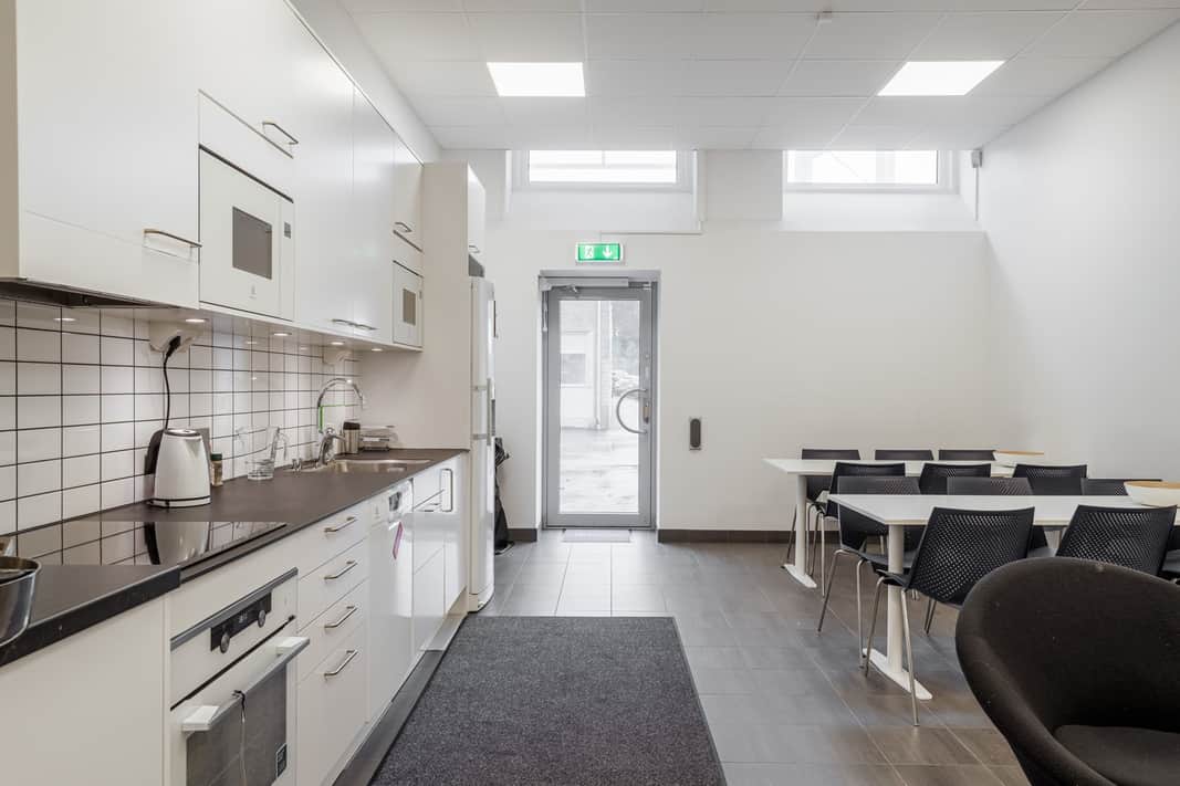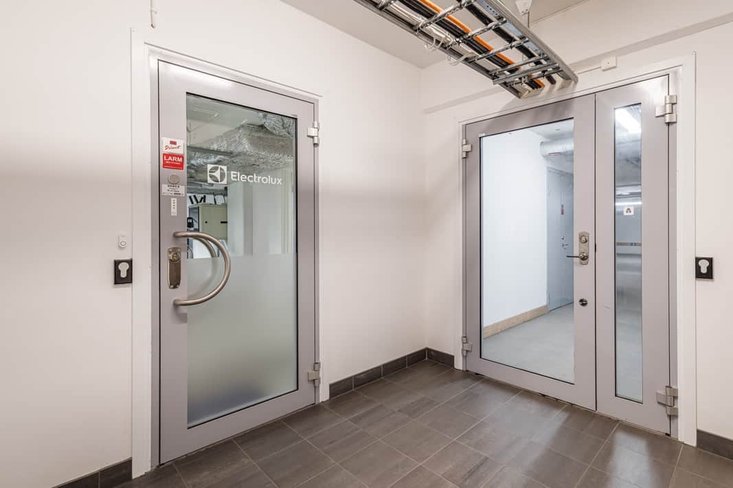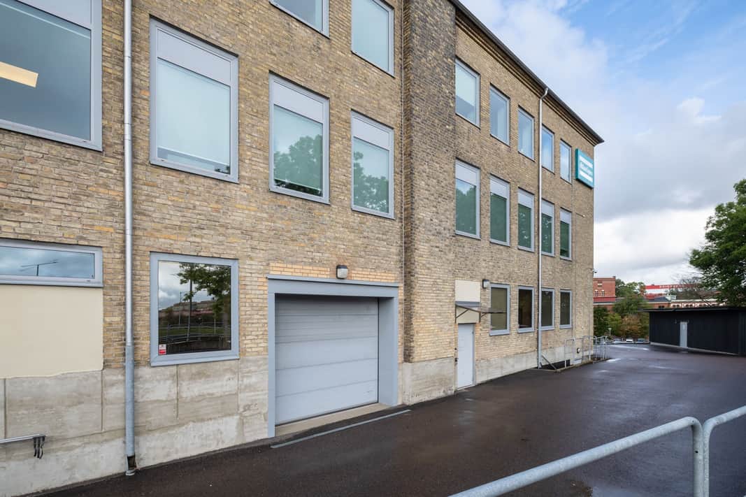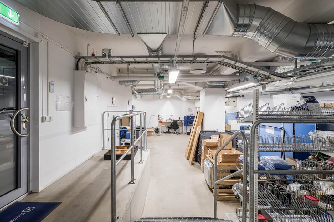 Lagerdel med två portar i markplan, kontorsrum, konferensrum samt pausytor.