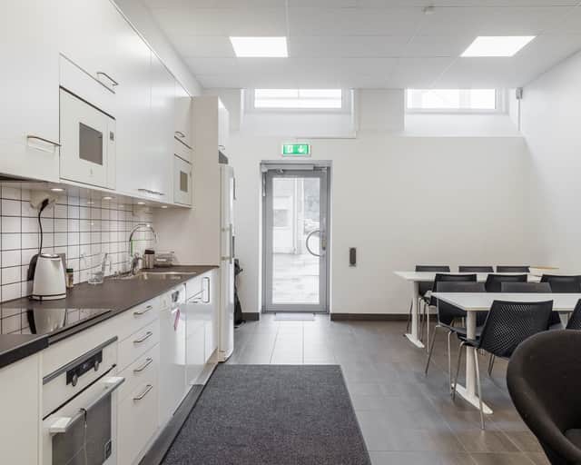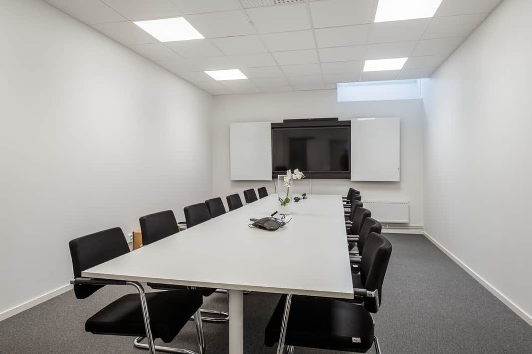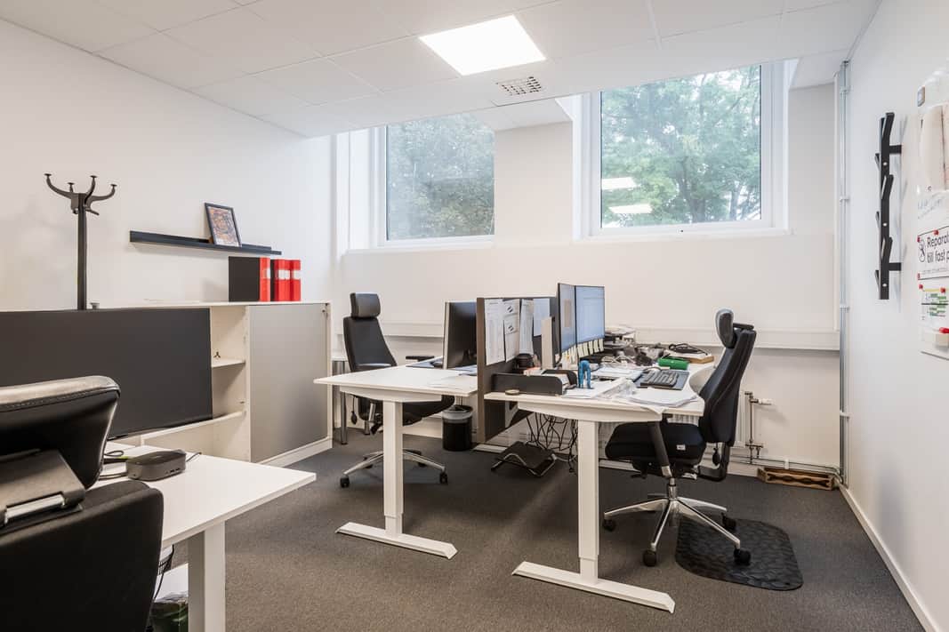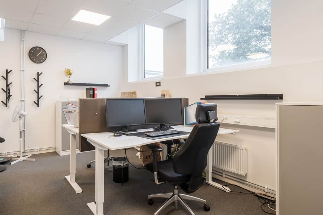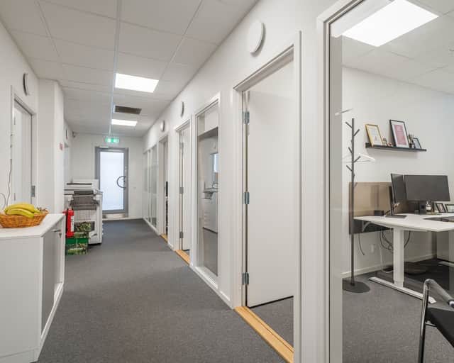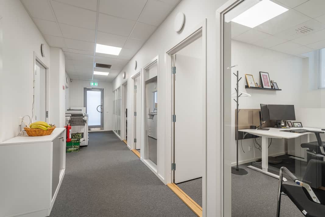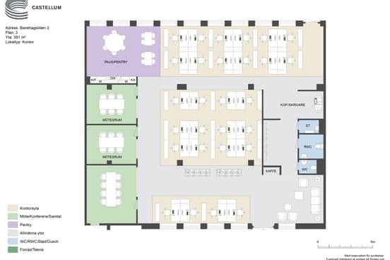 Lagerdel med två portar i markplan, kontorsrum, konferensrum samt pausytor.