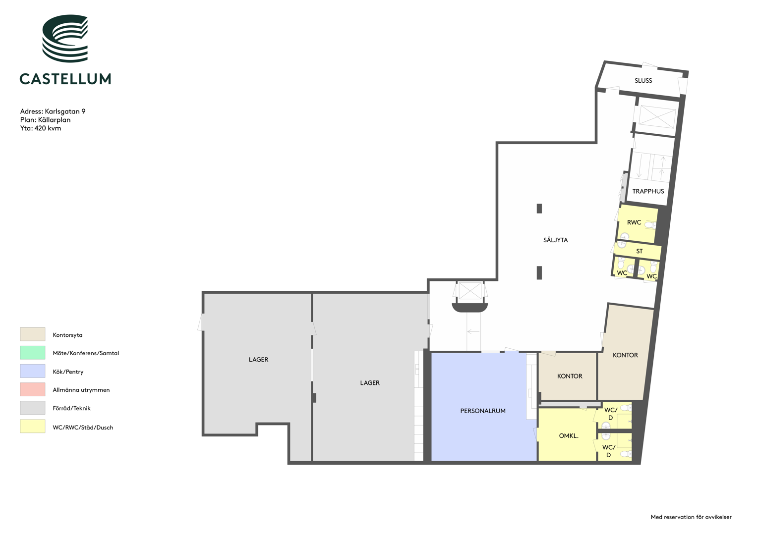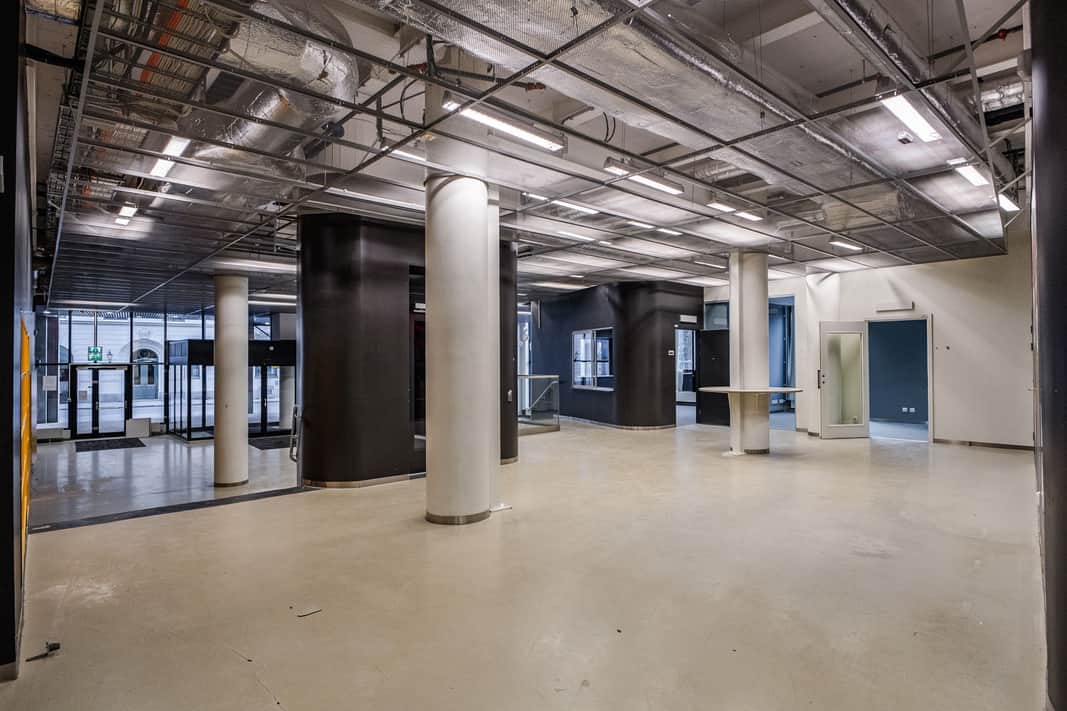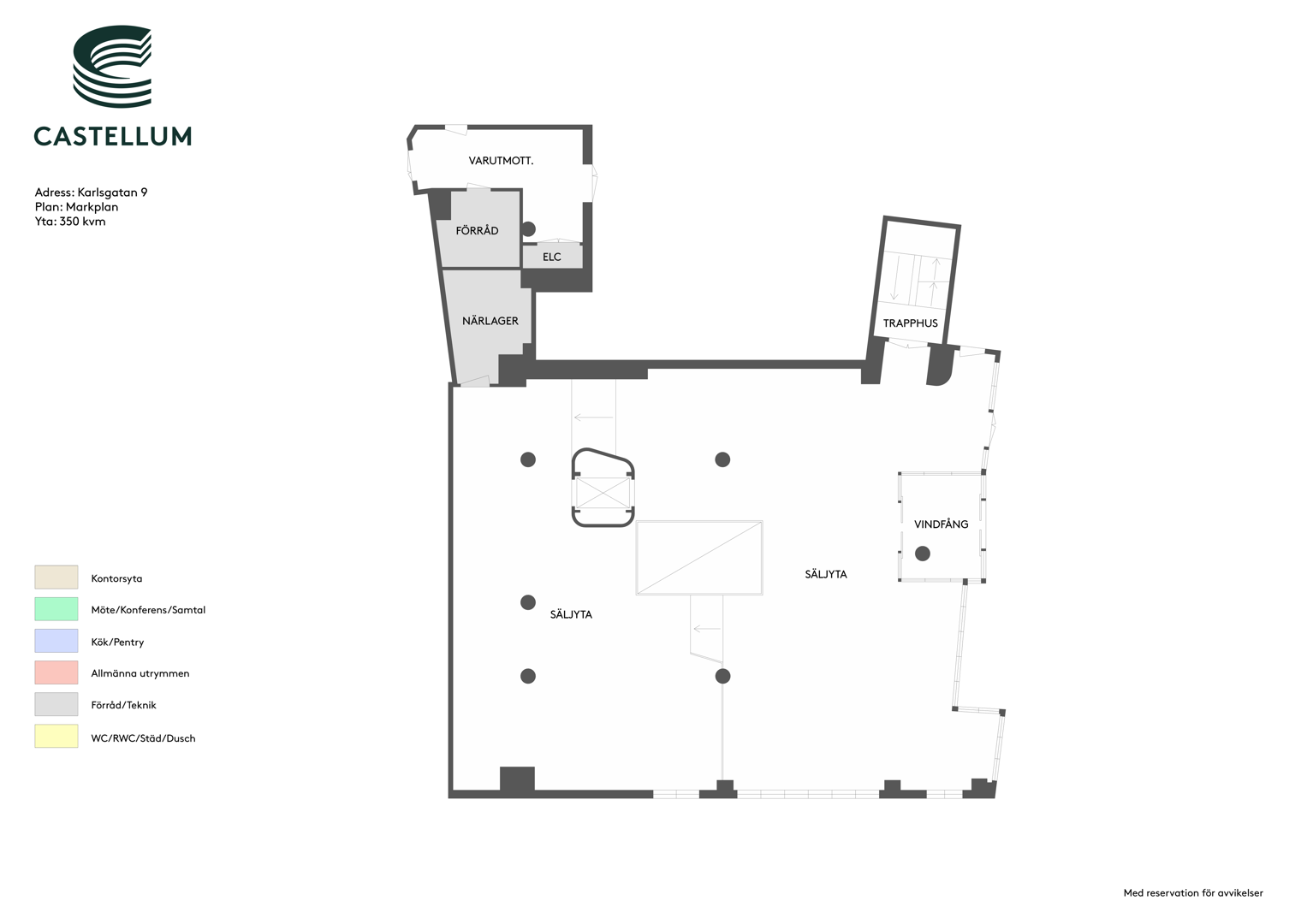 Lokalen är fördelad på två plan med cirka 350 kvm i markplan och resterande på planet under, vilket ger flexibla ytor för olika behov. Den öppna ytan kan användas för showroom, butik eller restaurang, medan planlösningen även ger möjlighet till lagerutrymme och andra funktioner. De stora fönstren i markplan ger synlighet och naturligt ljus, och den höga takhöjden på 5 meter skapar en rymlig och luftig känsla. Direkt access för inlastning via garage gör det enkelt att hantera varor och utrustning.