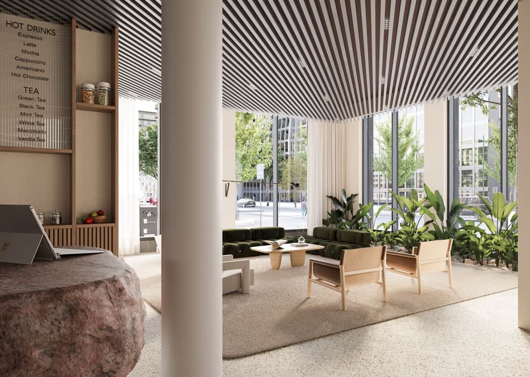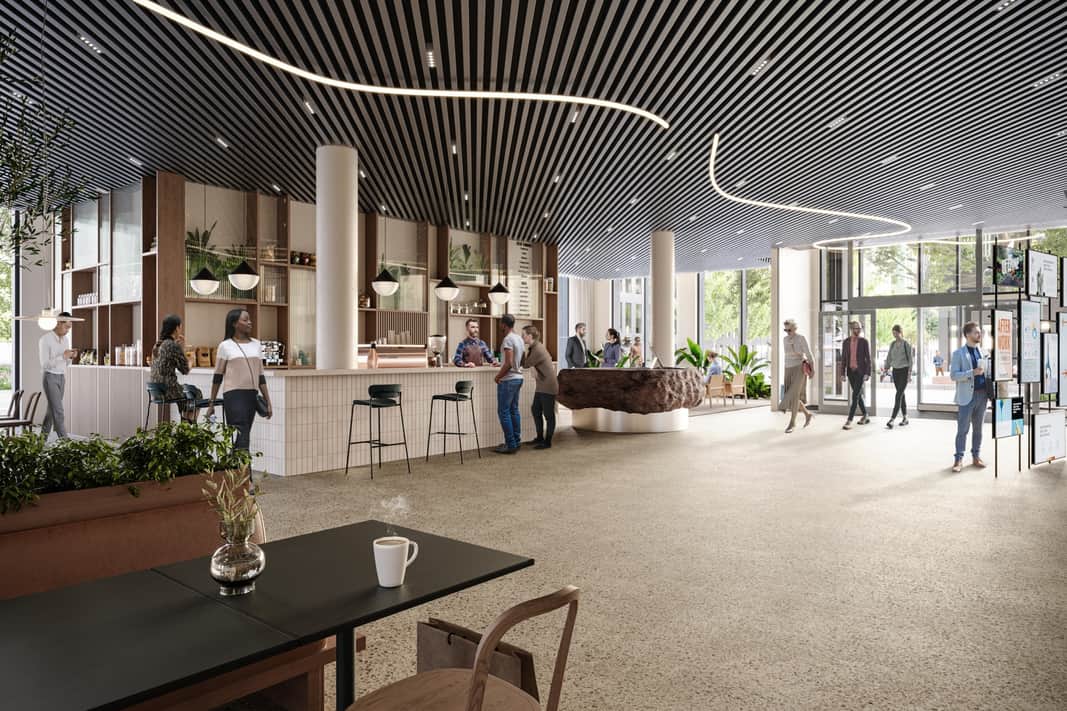 I fastighetens entré planerar vi för en välkomnande lounge med café, butiker, gemensam reception, konferensavdelning och träningsyta. I fastigheten finns även cykelparkering med tillhörande verkstad och laddmöjligheter samt omklädningsrum med skåp och duschar.