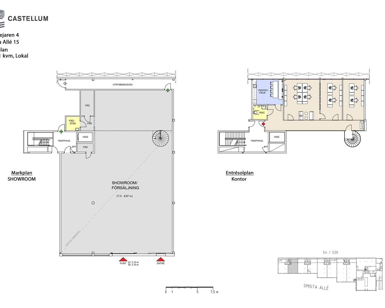 Lokalerna är modernt utformade med 6,6 meter fri takhöjd, stora glaspartier ut mot Smista Allé samt kontorsinredda entresolplan.
