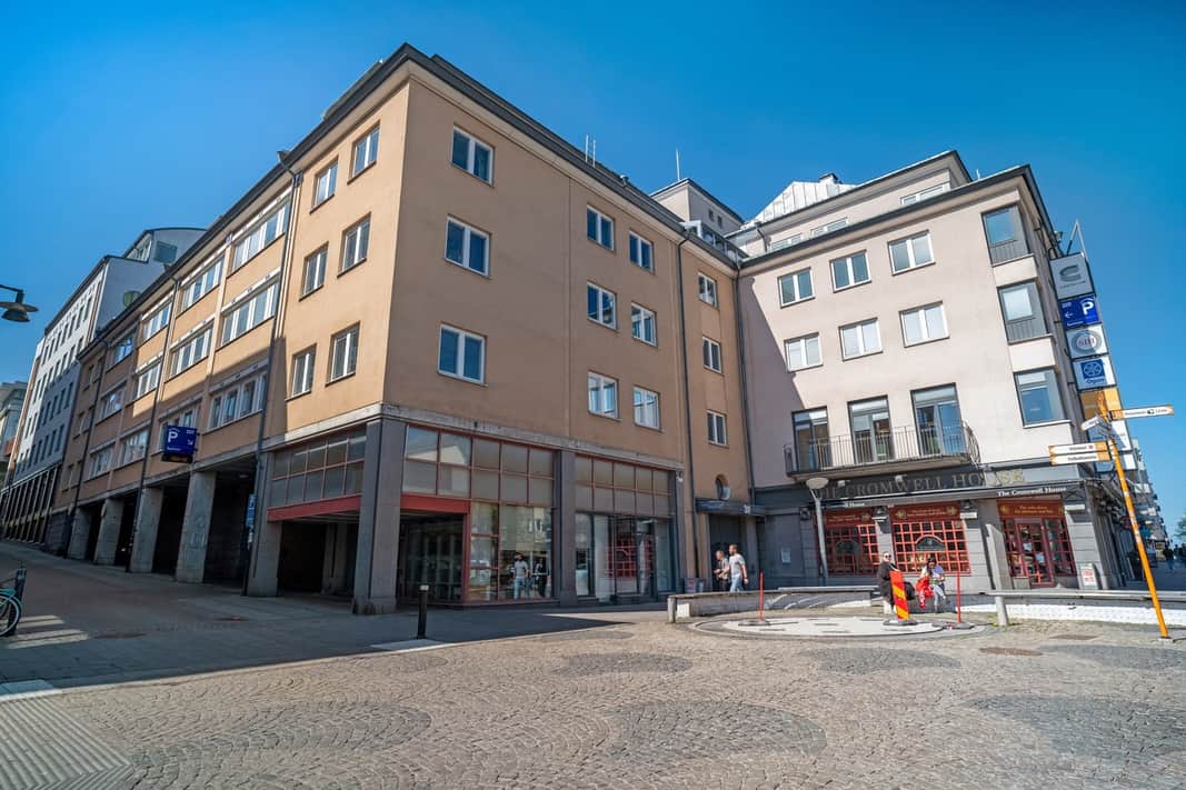Centralt belägen kontorsfastighet som även inrymmer butiker och restauranger i bottenplan. Till fastigheten hör även ett parkeringshus.