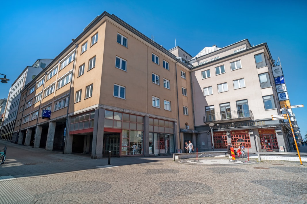 Centralt belägen kontorsfastighet som även inrymmer butiker och restauranger i bottenplan. Till fastigheten hör även ett parkeringshus.